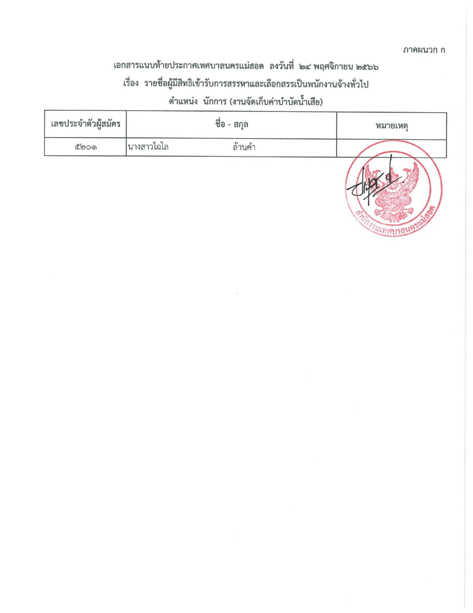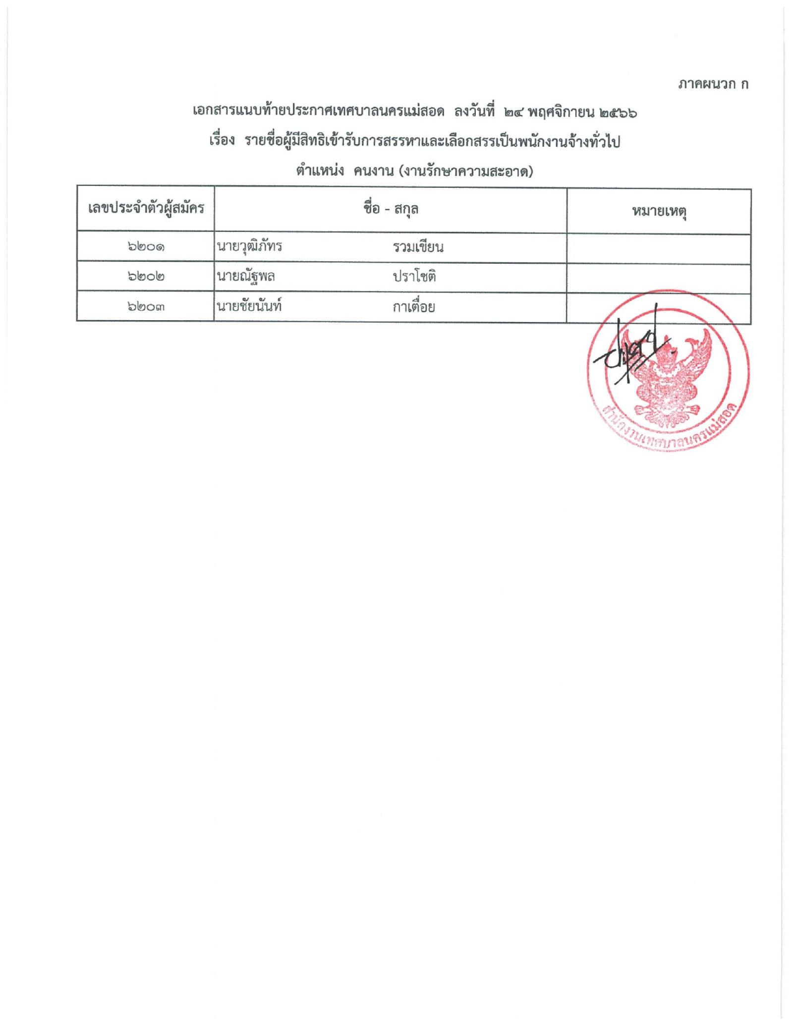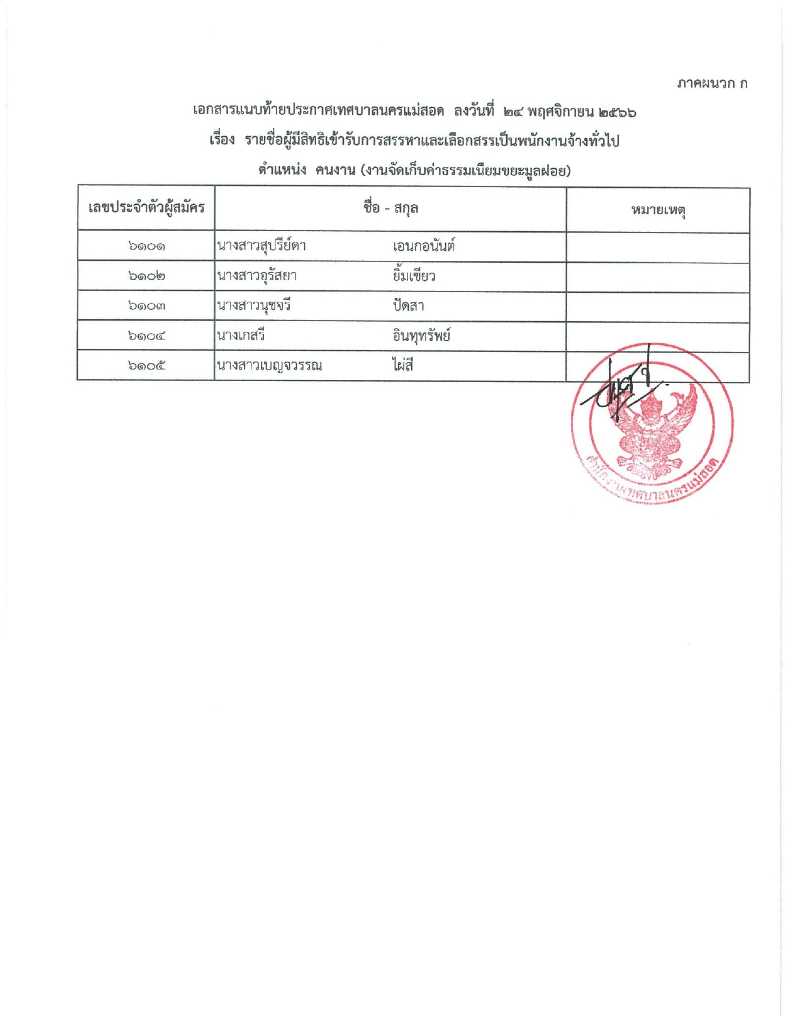ประกาศเทศบาลนครแม่สอด เรื่อง รายชื่อผู้มีสิทธิเข้ารับการสรรหาและเลือกสรรเป็นพนักงานจ้างทั่วไป กำหนดวัน เวลา สถานที่สอบ และระเบียบเกี่ยวกับการสอบ