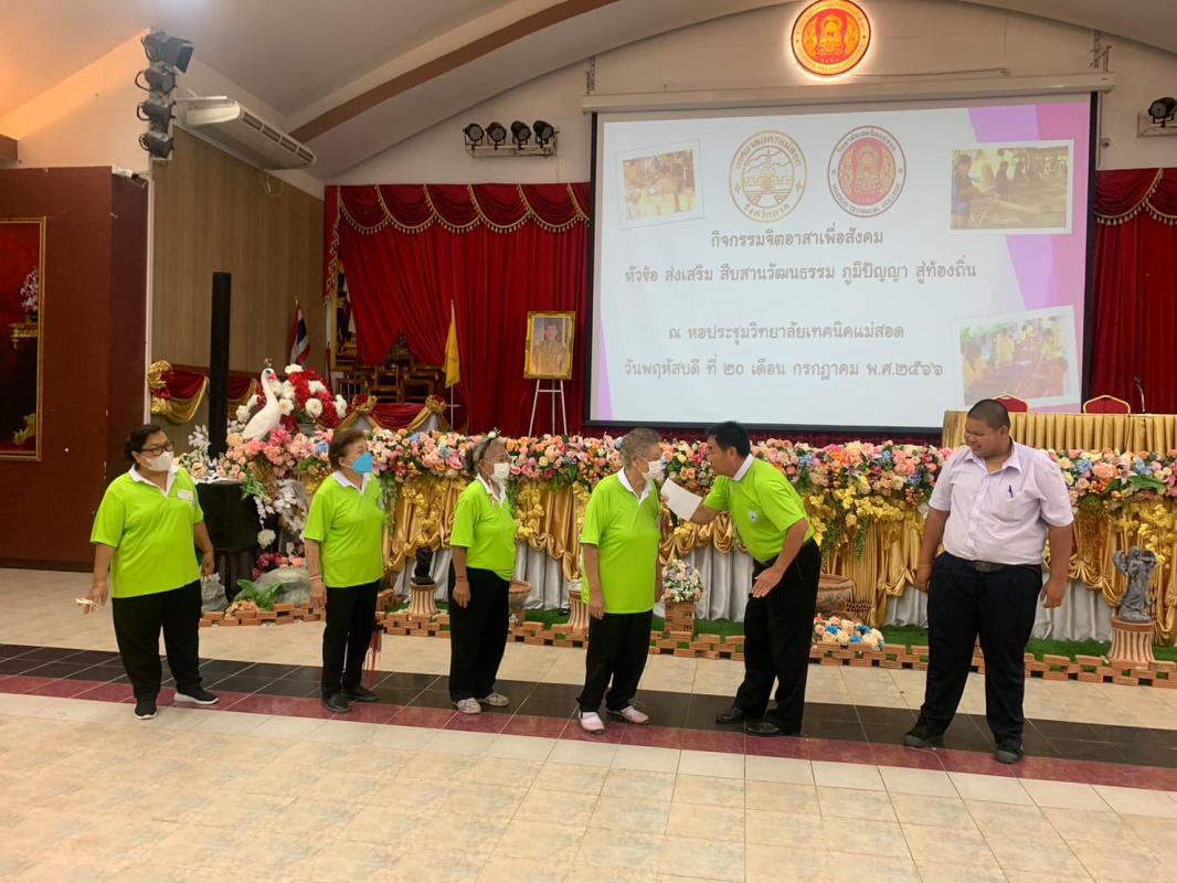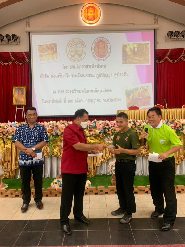 วันที่ 20 กรกฎาคม 2566 ได้รับเกียรติจาก ท่านไกรสร กิจการ รองนายกเทศมนตรี และท่านปรีชา เพชรปัญญา ที่ปรึกษานายกเทศมนตรี ได้นำคณะนักศึกษาจากวิทยาลัยสูงวัยนครแม่สอด ภายใต้โครงการส่งเสริมสุขภาพผู้สูงอายุ สร้างจิตสดใส ร่างกายแข็งแรง ร่วมกิจกรรมนอกสถานที่ ณ วิทยาลัยเทคนิคแม่สอด ซึ่งเป็นกิจกรรมสัปดาห์ที่ 8 กิจกรรมจิตอาสาเพื่อสังคม หัวข้อ ส่งเสริม สืบสานวัฒนธรรม ภูมิปัญญา สู่ท้องถิ่น โดย ทีมวิทยากรจาก วิทยาลัยเทคนิคแม่สอด นำโดย นายอดิธร สังฆจันทร์ ตำแหน่ง รองผู้อำนวยการวิทยาลัยเทคนิคแม่สอด