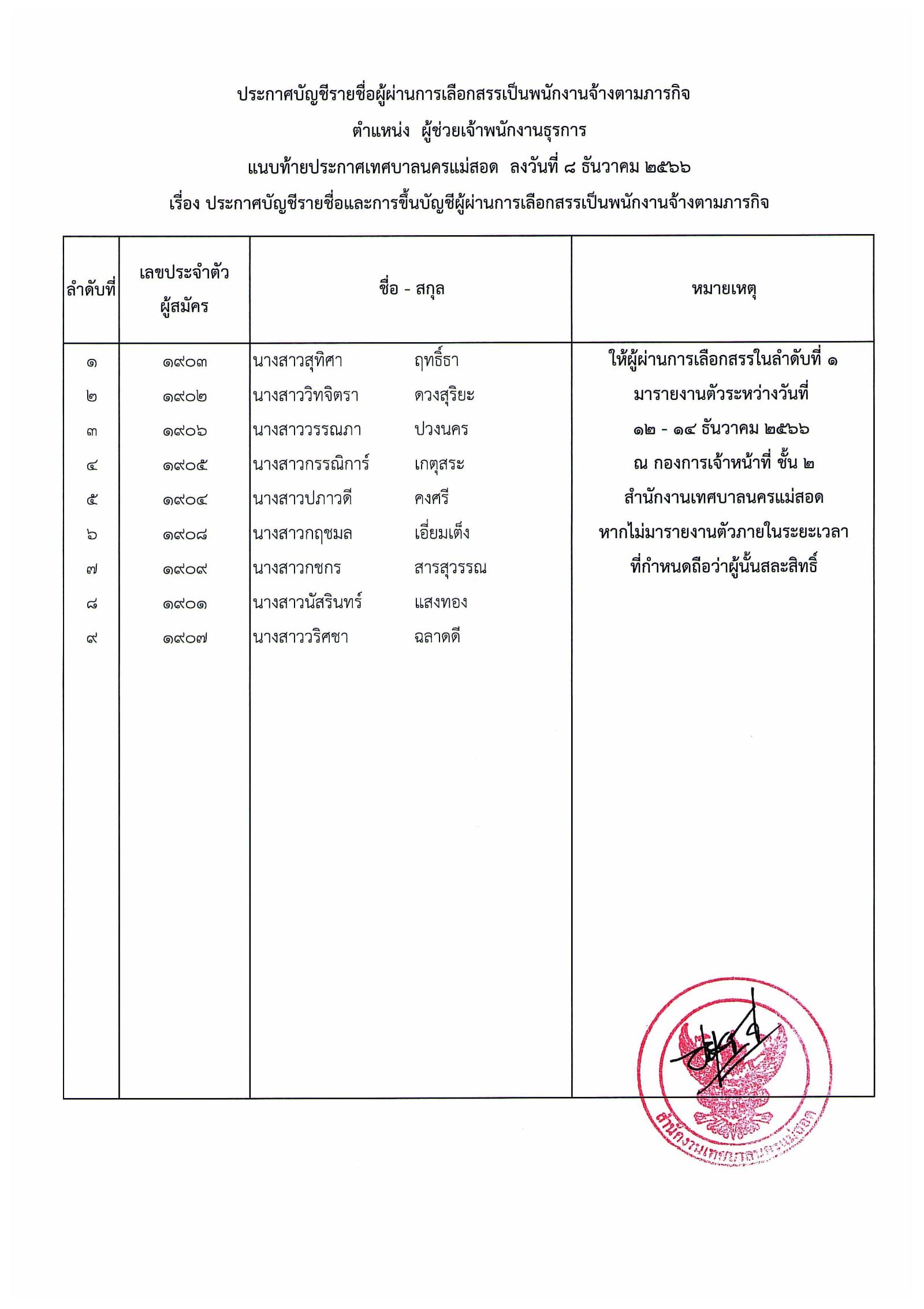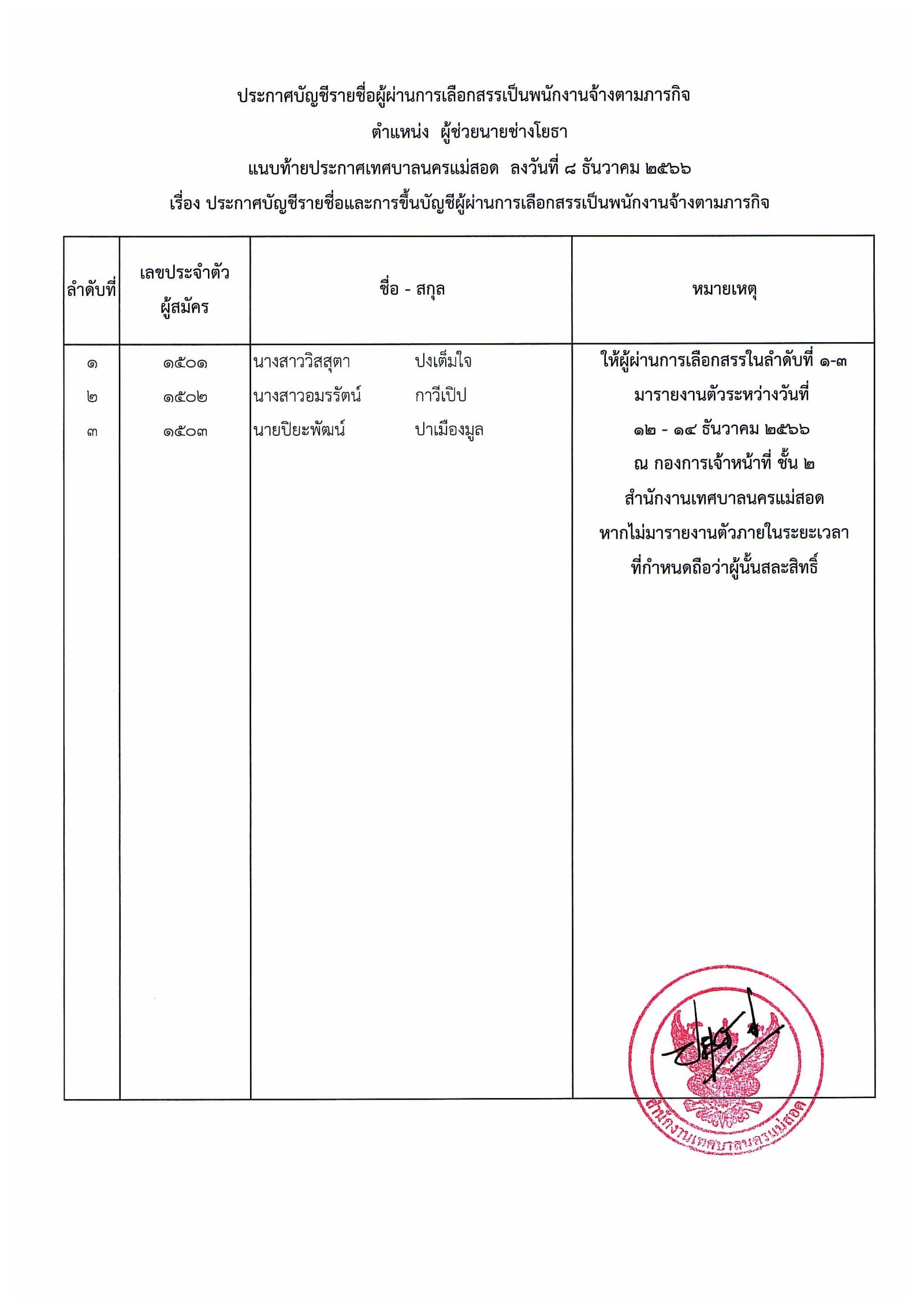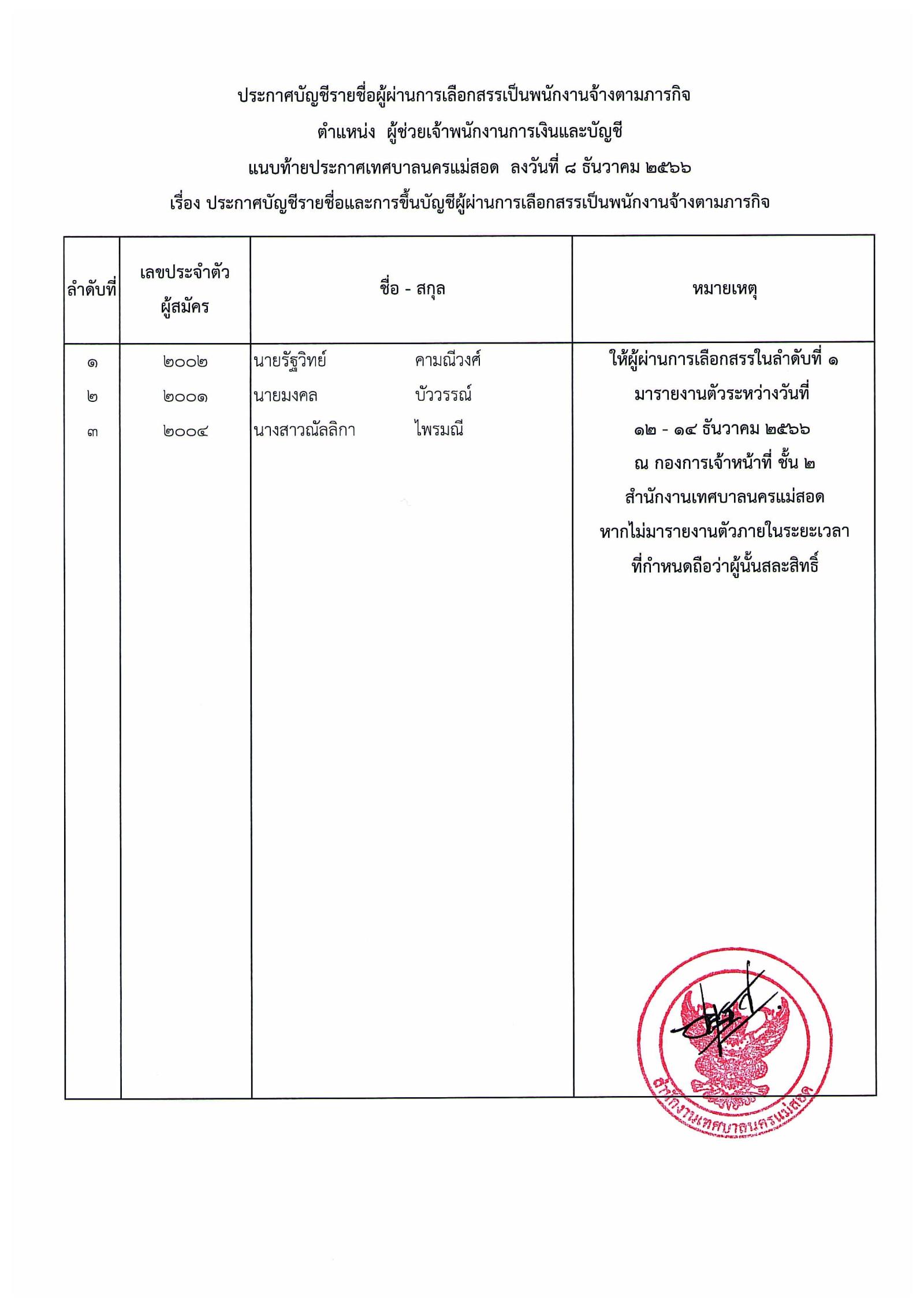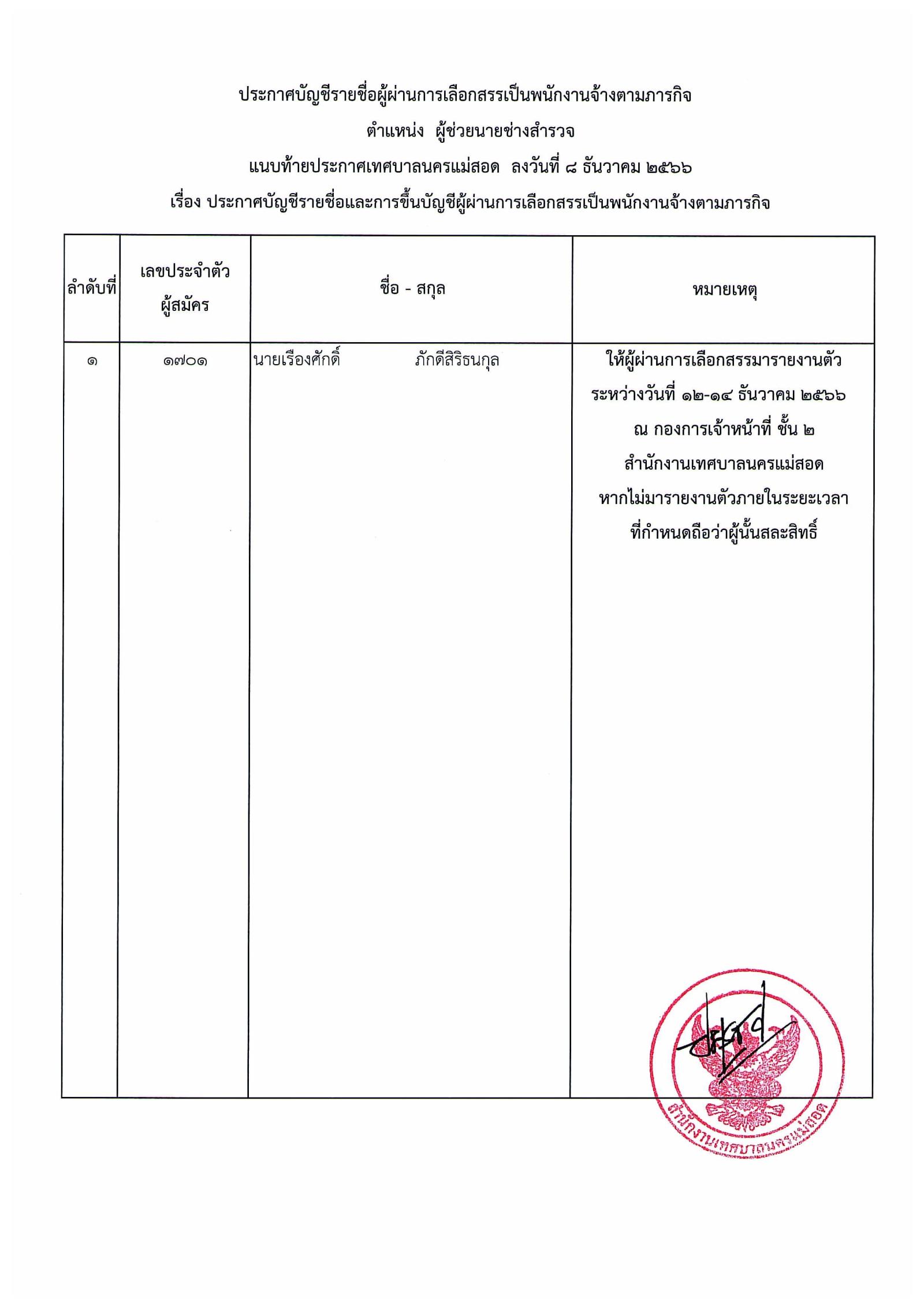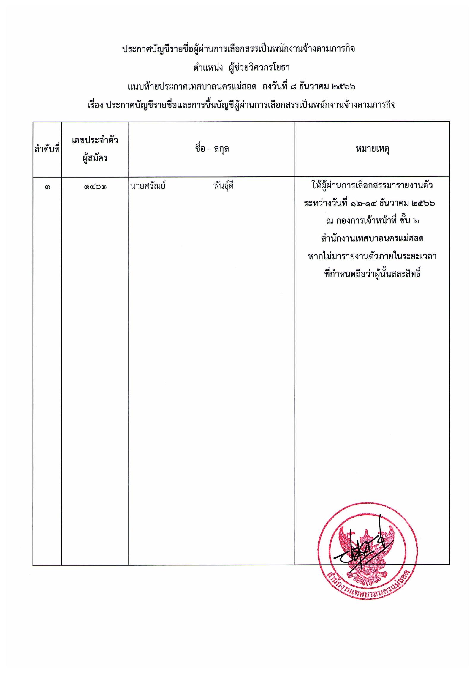 ประกาศเทศบาลนครแม่สอด เรื่อง บัญชีรายชื่อและการขึ้นบัญชีผู้ผ่านการเลือกสรรเป็นพนักงานจ้างตามภารกิจ.pdf