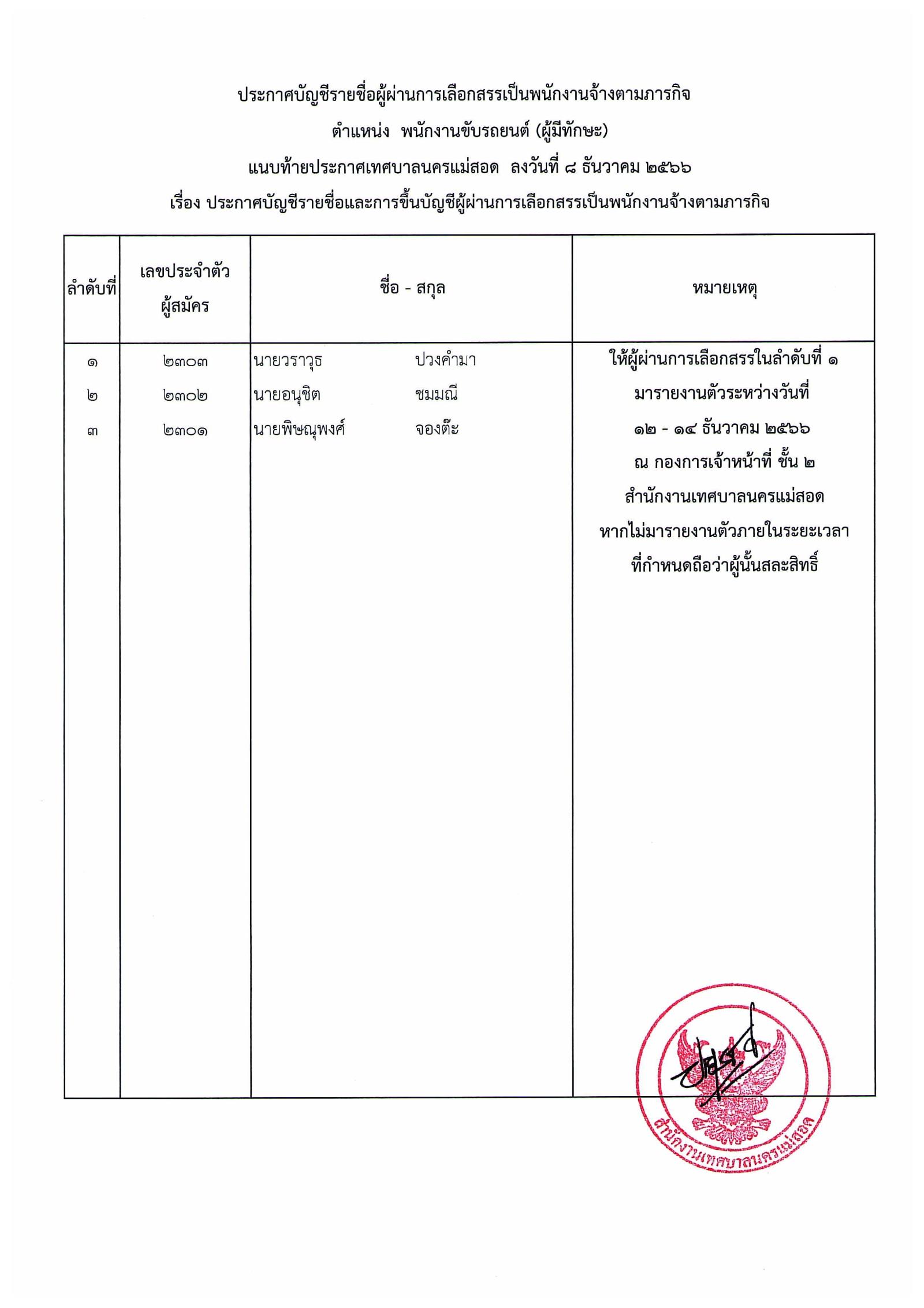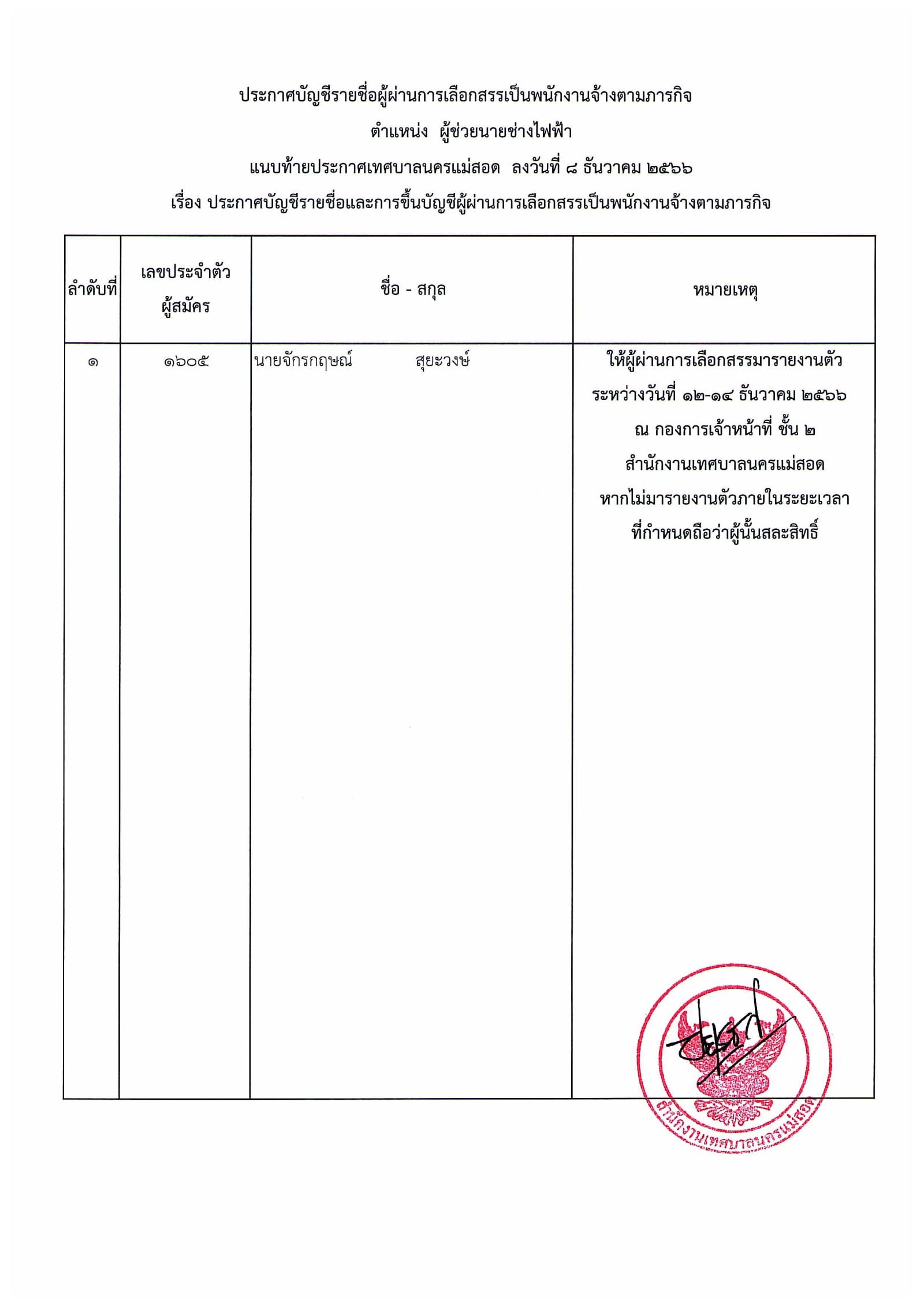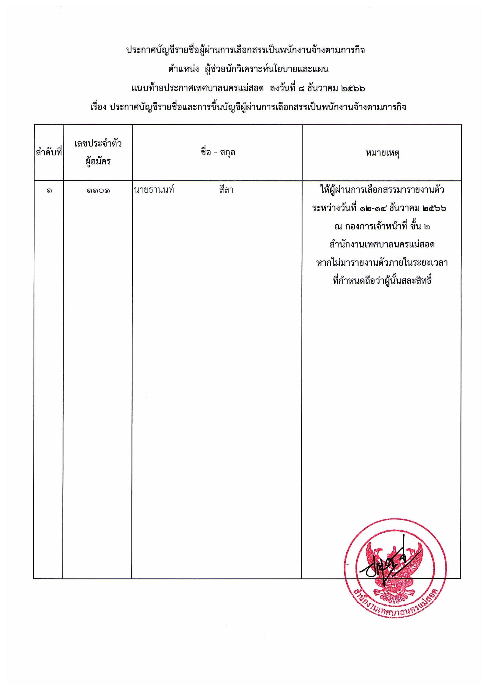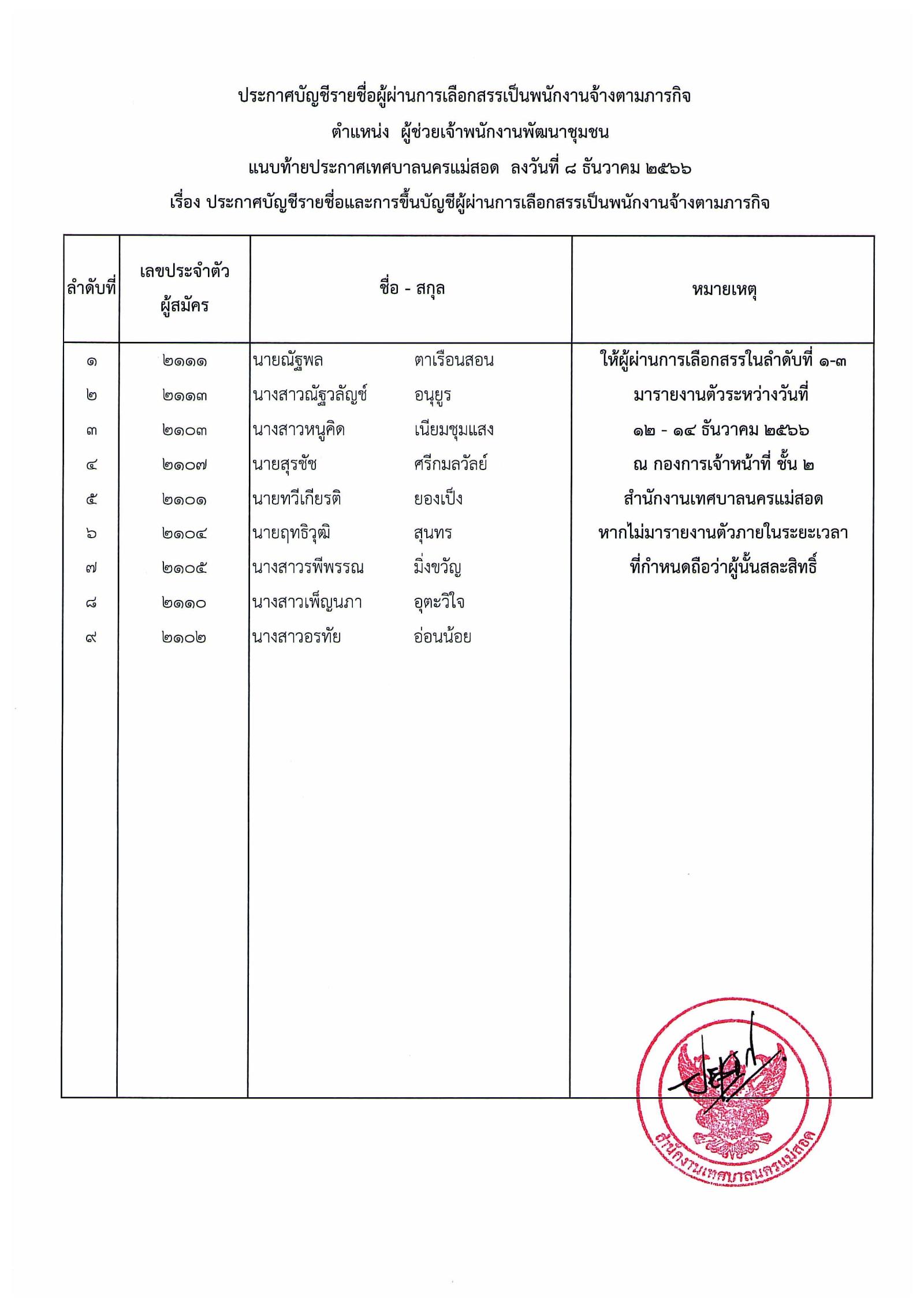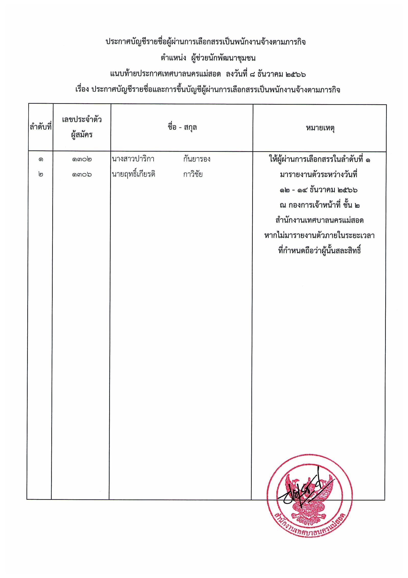 ประกาศเทศบาลนครแม่สอด เรื่อง บัญชีรายชื่อและการขึ้นบัญชีผู้ผ่านการเลือกสรรเป็นพนักงานจ้างตามภารกิจ.pdf