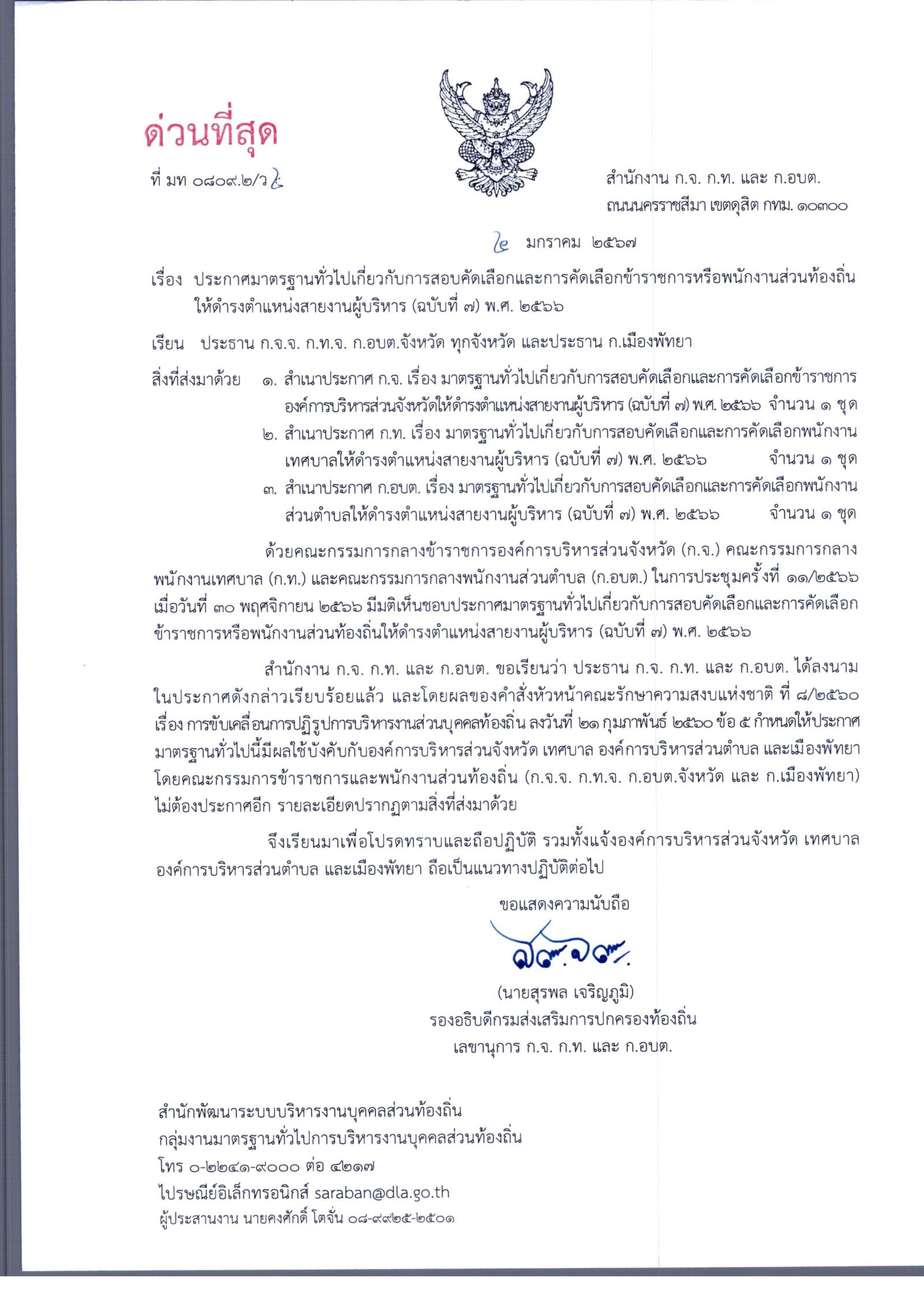 ประกาศ เรื่อง มาตรฐานทั่วไปเกี่ยวกับการสอบคัดเลือกและการคัดเลือกข้าราชการ พนักงานเทศบาล พนักงานส่วนตำบล ให้ดำรงตำแหน่งสายงานผู้บริหาร ฉบับที่ 7 พ ศ 2566.pdf