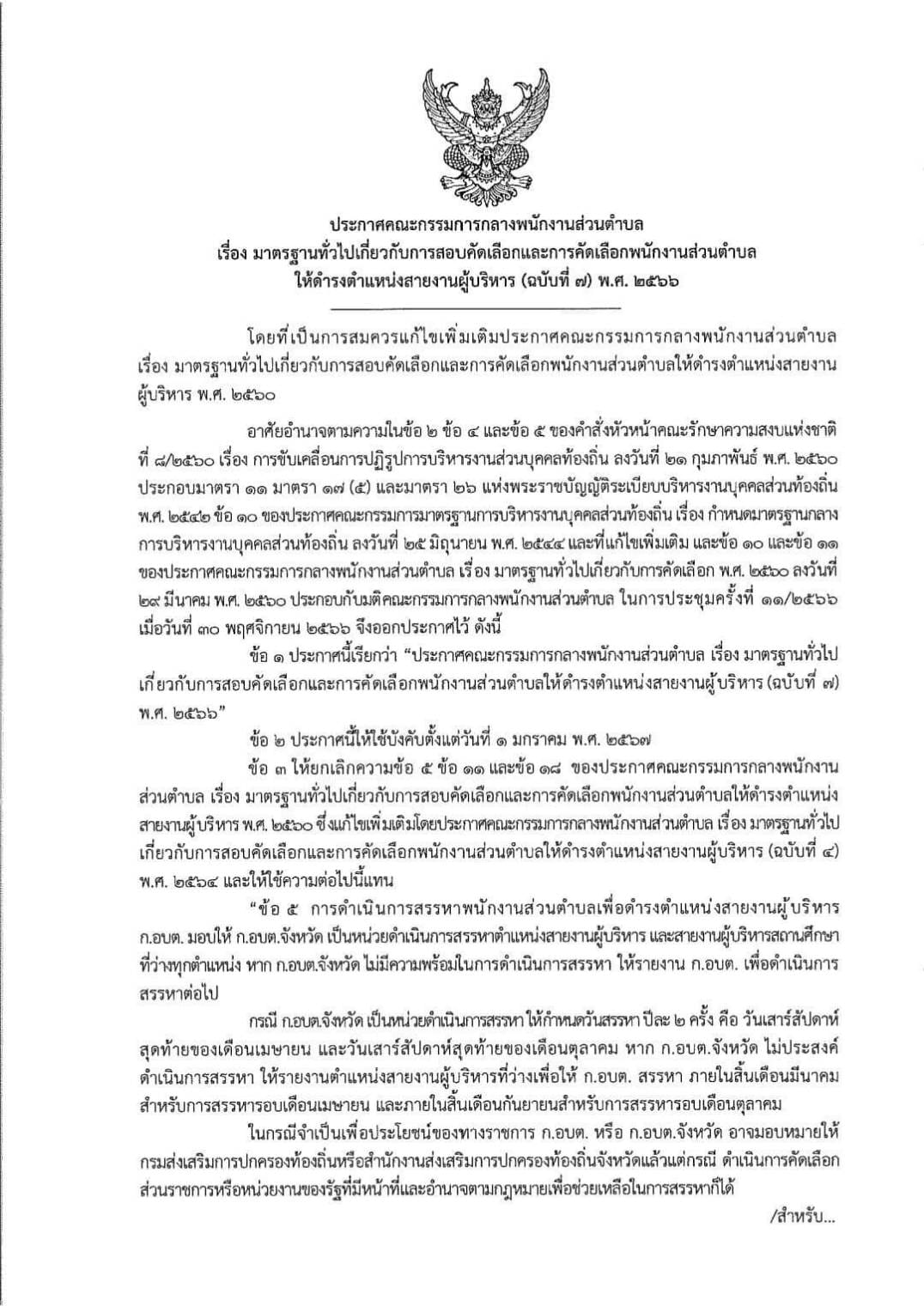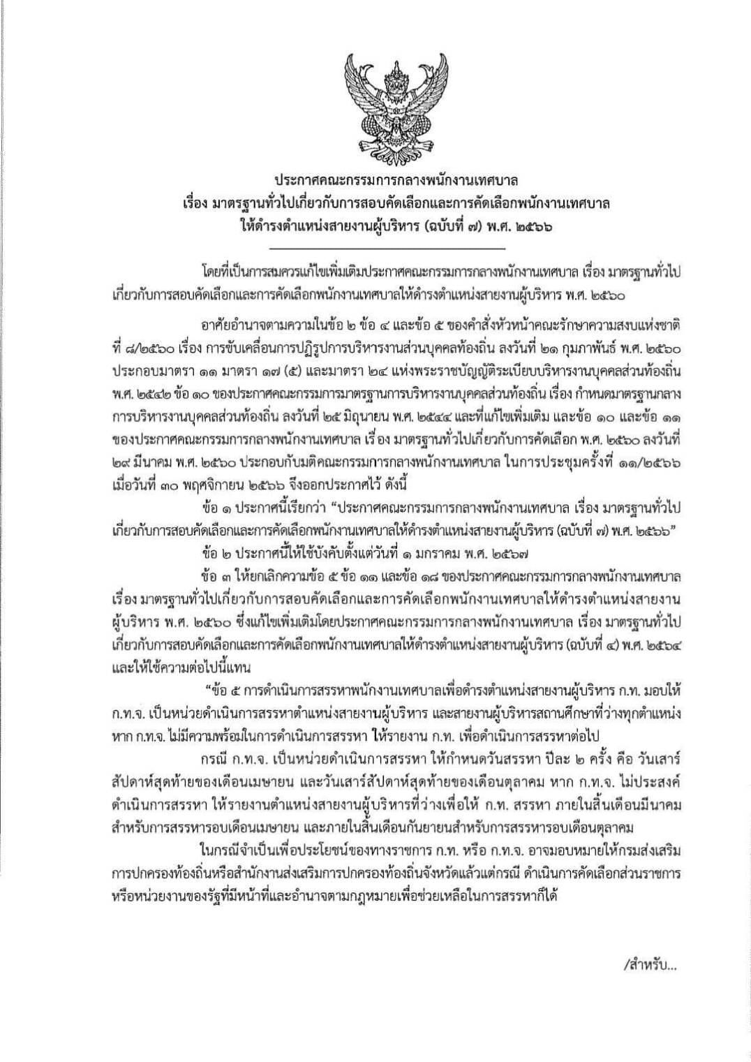 ประกาศ เรื่อง มาตรฐานทั่วไปเกี่ยวกับการสอบคัดเลือกและการคัดเลือกข้าราชการ พนักงานเทศบาล พนักงานส่วนตำบล ให้ดำรงตำแหน่งสายงานผู้บริหาร ฉบับที่ 7 พ.ศ. 2566