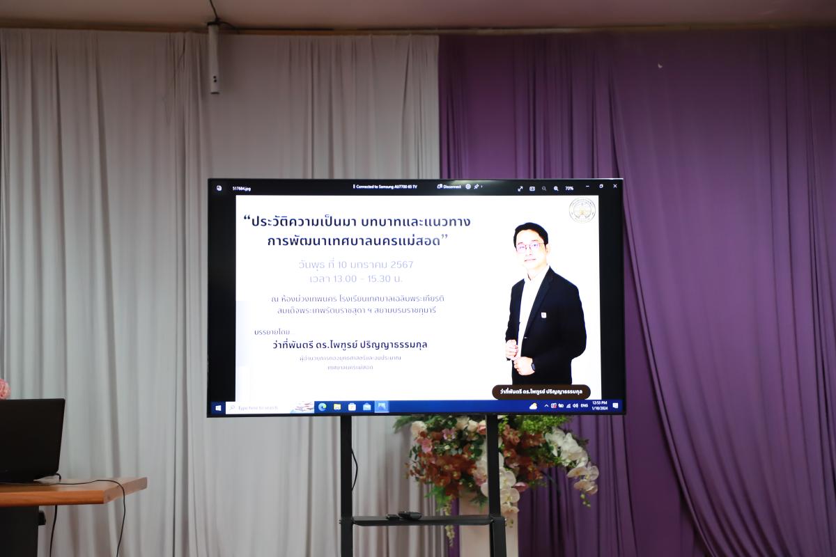ว่าที่พันตรี ดร.ไพฑูรย์ ปริญญาธรรมกุล ผู้อำนายการกองยุทธศาสตร์และงบประมาณเทศบาลนครแม่สอด ได้รับเกียรติให้เป็นวิทยากรให้ความรู้แก่นักเรียนโรงเรียนเทศบาลเฉลิมพระเกียรติสมเด็จพระเทพรัตนราชสุดา ฯ สยามบรมราชกุมารี ในเรื่องประวัติความเป็นมา บทบาท และแนวทางการพัฒนาเทศบาลนครแม่สอด สำหรับนักเรียนระดับชั้นมัธยมศึกษาปีที่ 5 จำนวน 84 คน เพื่อส่งเสริมให้นักเรียนได้เข้าใจถึงระบบบริหารงานขององค์กรปกครองส่วนท้องถิ่น ซึ่งเป็นส่วนหนึ่งของกลุ่มสาระการเรียนรู้สังคมศึกษา ศาสนาและวัฒนธรรม