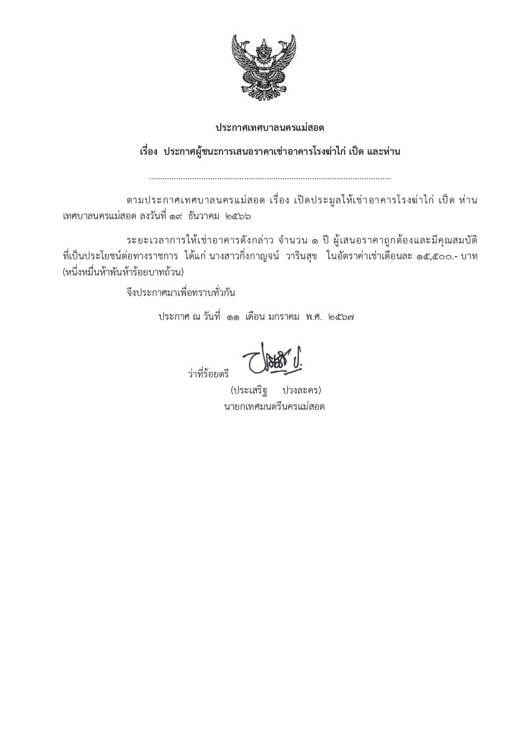 ประกาศเทศบาลนครแม่สอด เรื่อง ประกาศผู้ชนะการเสนอราคาเช่าอาคารโรงฆ่าไก่ เป็ด และ ห่าน