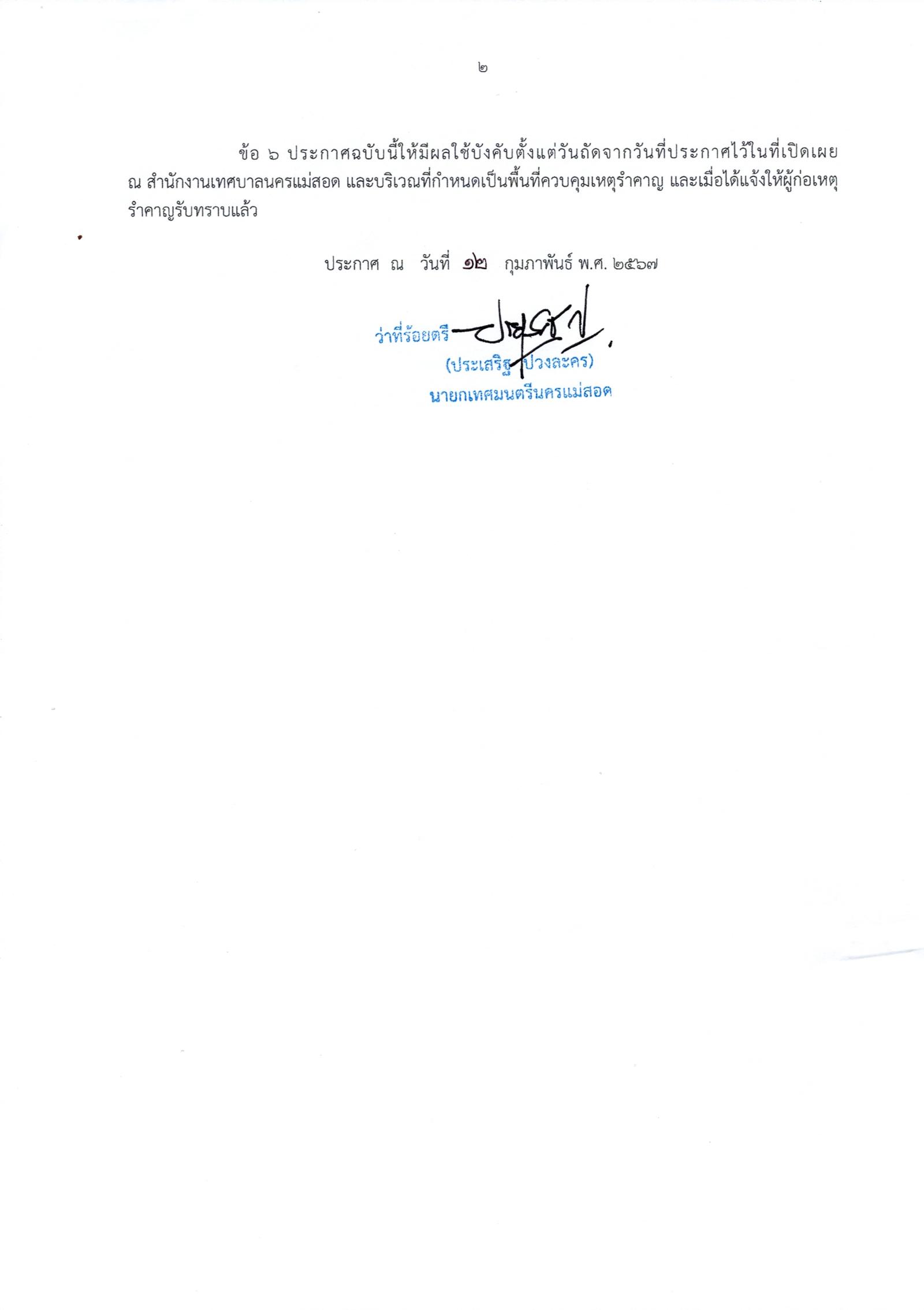 ประกาศเทศบาลนครแม่สอด เรื่อง กำหนดพื้นที่ควบคุมเหตุรำคาญ พศ.2567