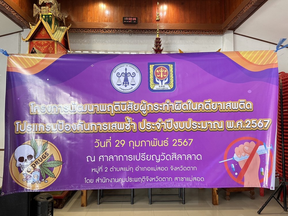 ว่าที่พันตรี ดร.ไพฑูรย์ ปริญญาธรรมกุล ประธานชมรมอาสาสมัครคุมประพฤติ สาขาแม่สอด เป็นประธานในพิธีเปิดกิจกรรมอบรมป้องกันการเสพซ้ำ พร้อมด้วยคณะกรรมการอาสาสมัครคุมประพฤติ เจ้าหน้าที่สำนักงานคุมประพฤติจังหวัดตาก สาขาแม่สอด และผู้เกี่ยวข้อง ร่วมเป็นเกียรติ เพื่อเป็นขวัญและกำลังใจแก่ผู้ถูกคุมความประพฤติ ในโครงการพัฒนาพฤตินิสัยผู้กระทำผิดในคดียาเสพติด โครงการแก้ไขฟื้นฟู โปรแกรมป้องกันการเสพซ้ำ ประจำปีงบประมาณ พ.ศ.2567