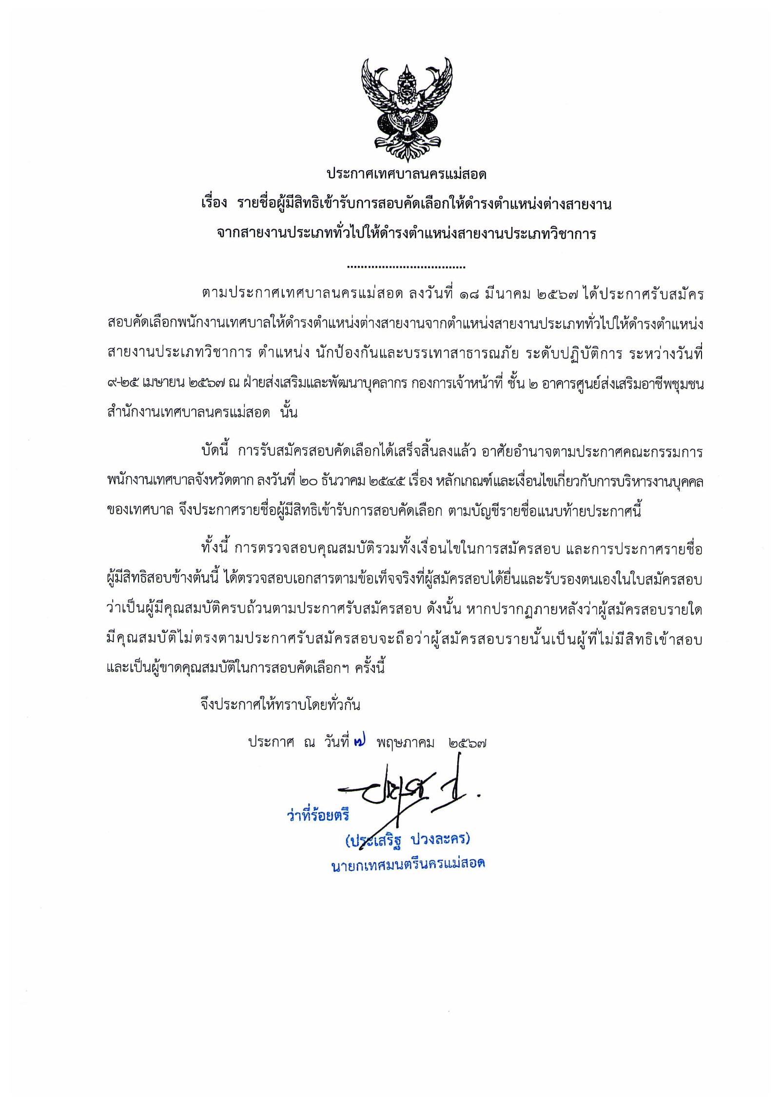 ประกาศเทศบาลนครแม่สอด เรื่อง ประกาศบัญชีรายชื่อและการขึ้นบัญชีผู้ผ่านการเลือกสรรเป็นพนักงานจ้าง