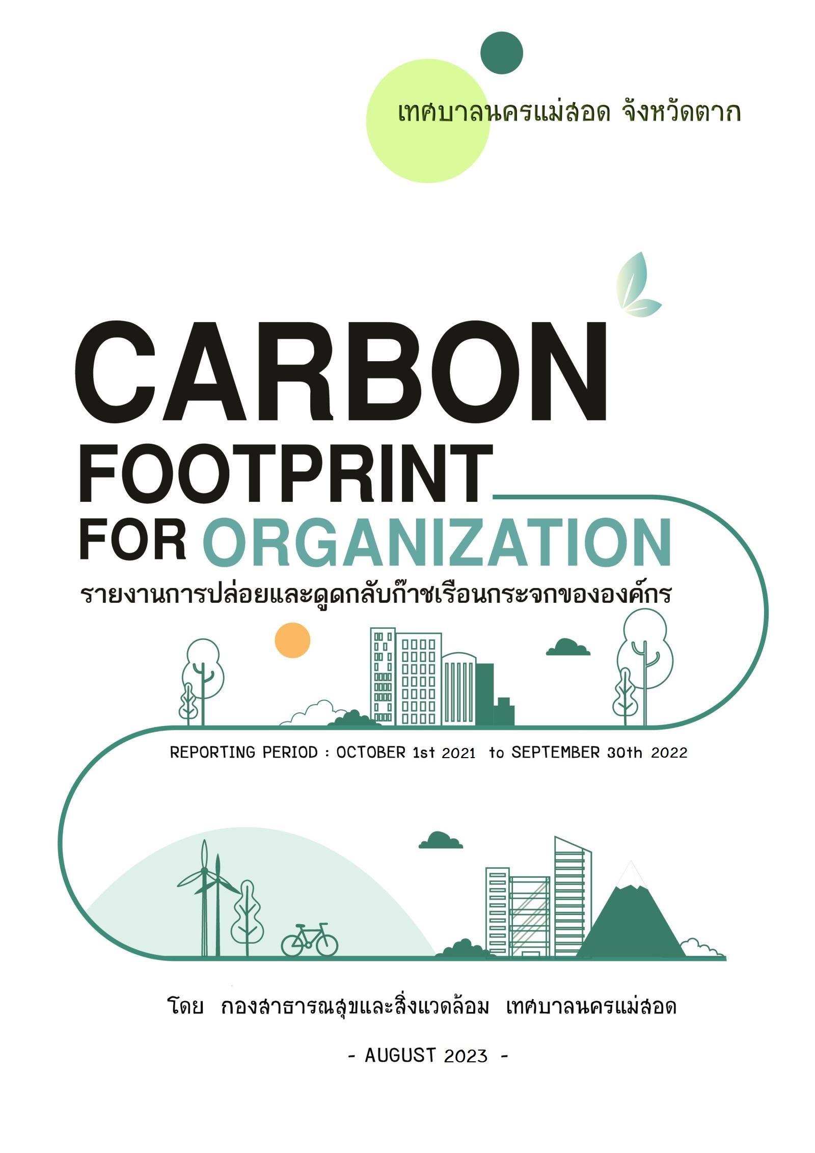 เทศบาลนครแม่สอด ได้เข้าร่วมโครงการจัดทำคาร์บอนฟุตพริ้นท์ขององค์กรปกครองส่วนท้องถิ่น ประจำปี 2566 โดยมีระยะเวลาในการติดตามผล ตั้งแต่วันที่ 1 ่ตุลาคม 2564 ถึง 30 กันยายน 2565 (ปีงบประมาณ 2565) และได้จัดทำรายงานการปล่อยและดูดกลับก๊าซเรือนกระจกขององค์กร โดยการระบุแหล่งปล่อยก๊าซเรือนกระจกขององค์กร แล้วมาคำนวณปริมาณการปล่อยก๊าซเรือนกระจกที่เกิดขึ้นจากกิจกรรมต่าง ๆ เพื่อรายงานการปล่อยก๊าซเรือนกระจกที่เกิดขึ้นจากกิจกรรมต่าง ๆ และการบริการขององค์กร อันเป็นการสนับสนุนต่อการกำหนดแนวทางและมาตรการในอนาคต ตลอดจนเพื่อเป็นตัวอย่างความสำเร็จและชี้นำสังคมในการแสดงความรับผิดชอบต่อสังคมและสิ่งแวดล้อม ก้าวสู่ความเป็น “เมืองคาร์บอนต่ำ” ที่ยั่นยืนในอนาคต