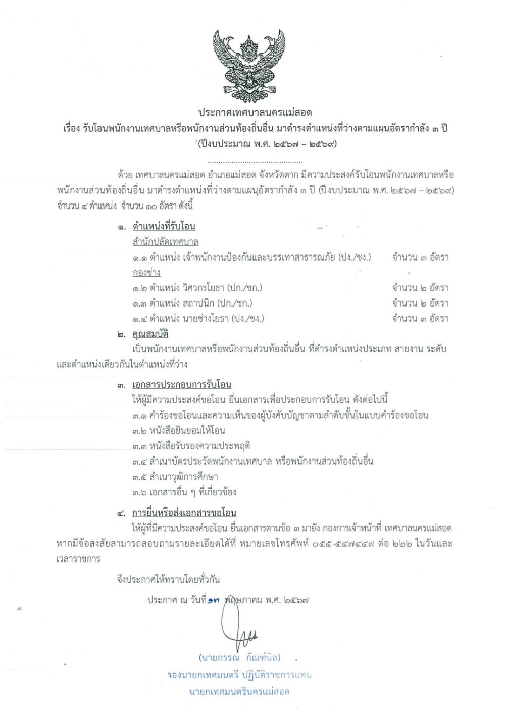 ประกาศเทศบาลนครแม่สอด เรื่อง รับโอนพนักงานเทศบาลหรือพนักงานส่วนท้องถิ่นอื่น มาดำรงตำแหน่งว่างตามแผนอัตรากำลัง 3 ปี