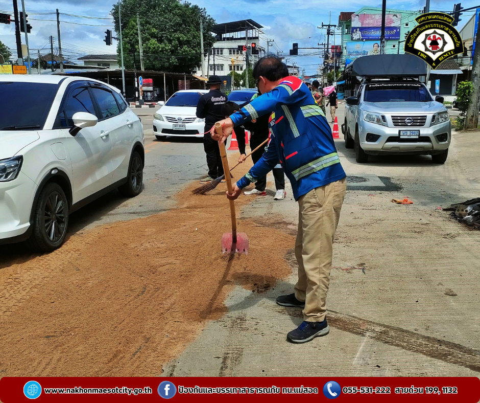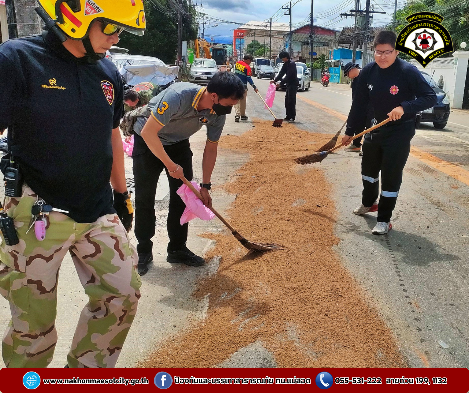 ต่อมาเวลาประมาณ 10.40 น. เจ้าหน้าที่ดับเพลิงนครแม่สอด ได้ออกดำเนินการนำทรายหยาบกลบคราบน้ำมัน ทำความสะอาดพื้นผิวถนนการจราจร เพื่อป้องกันการเกิดอุบัติเหตุซ้ำซ้อนขึ้น ดำเนินการจนแล้วเสร็จ