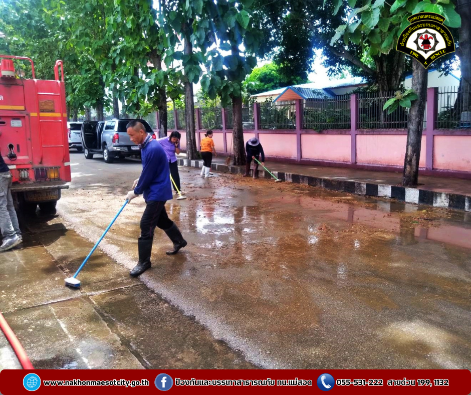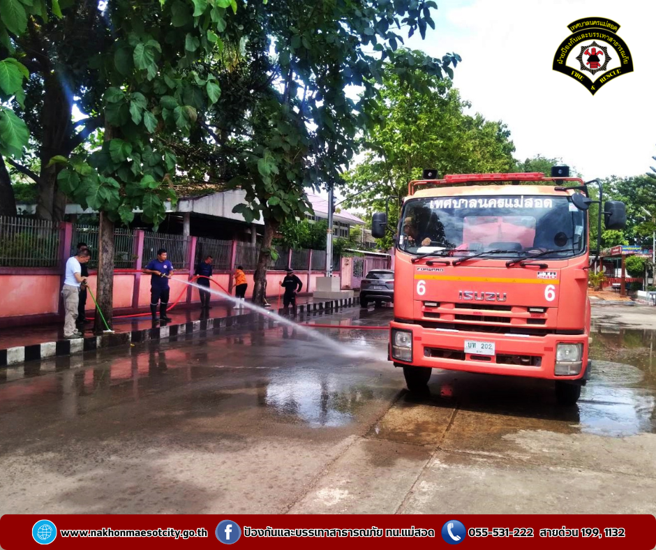วันพฤหัสบดีที่ 4 กรกฎาคม 2567 เวลา 13.30 น. ว่าที่ร้อยตรี ประเสริฐ ปวงละคร นายกเทศมนตรีนครแม่สอด มอบหมายให้เจ้าหน้าที่ดับเพลิงนครแม่สอด นำรถยนต์บรรทุกน้ำดับเพลิง จำนวน 1 คัน ออกดำเนินการฉีดล้างทำความสะอาด ลานอเนกประสงค์ของเรือนจำอำเภอแม่สอด จังหวัดตาก ตามคำร้องขอความอนุเคราะห์ฯ เพื่อขจัดเศษ หิน ดิน ทราย รวมถึงสิ่งปนเปื้อนบนพื้นผิวถนน และเพื่อเตรียมการต้อนรับและตรวจเยี่ยม
