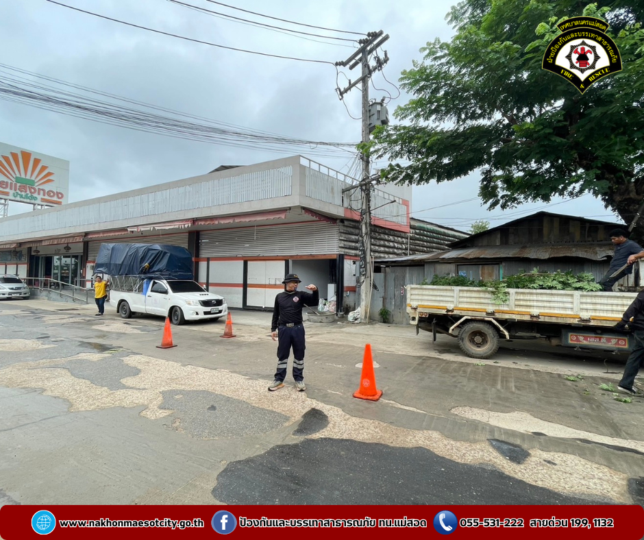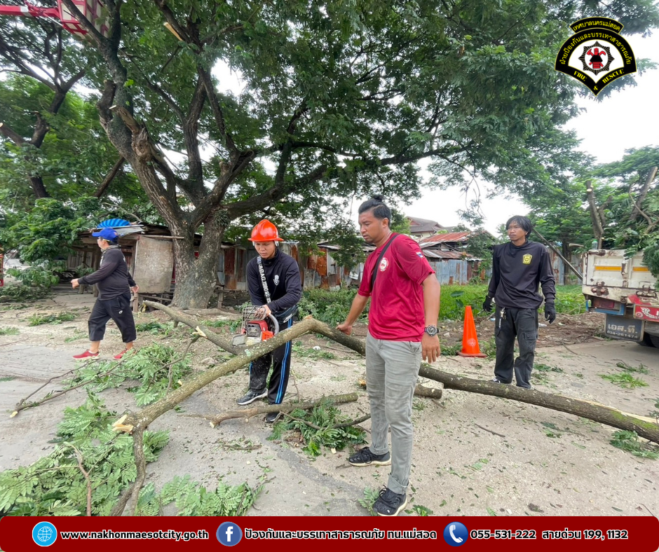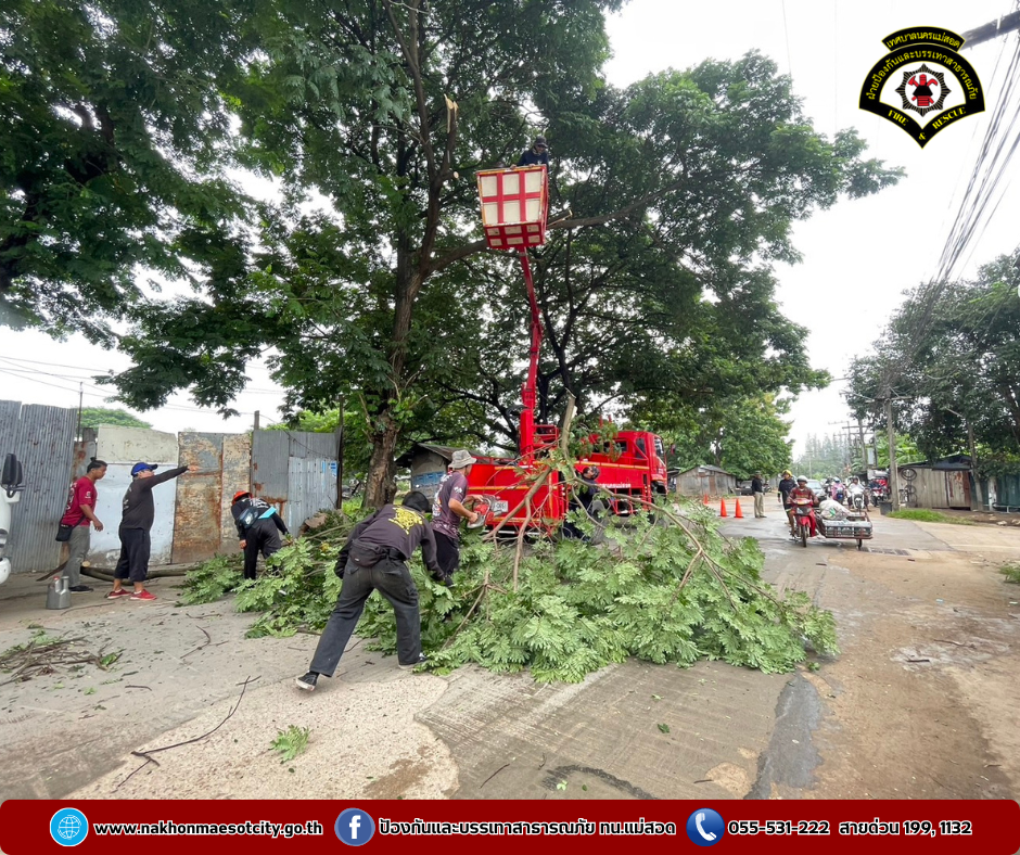 ดับเพลิงนครแม่สอด จึงนำรถยนต์บรรทุก 6 ล้อ และรถบรรทุกกระเช้าไฟฟ้า พร้อมอุปกรณ์ ดำเนินการตัดต้นไม้ดังกล่าว โดยใช้เลื่อยโซ่ยนต์ และใช้มีด ดำเนินการตัดจนแล้วเสร็จ พร้อมยกใส่รถยนต์บรรทุก 6 ล้อ ดำเนินการนำกิ่งไม้ไปทิ้งต่อไป เพื่อความเป็นระเบียบเรียบร้อย ความปลอดภัยต่อผู้ใช้รถใช้ถนน บริเวณดังกล่าว