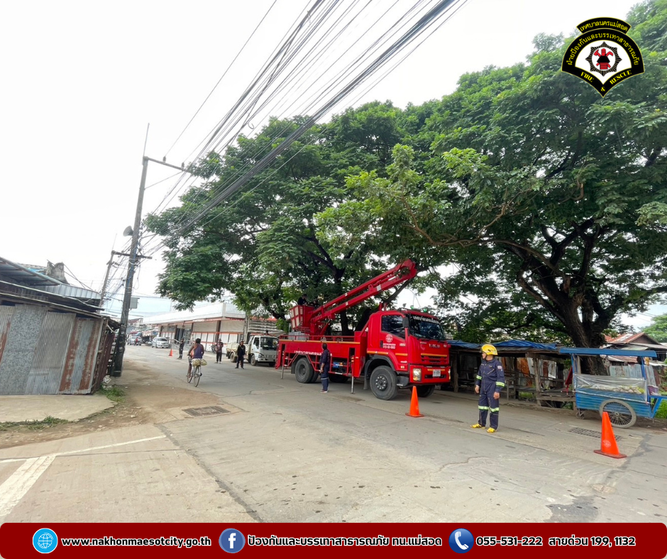 วันจันทร์ที่ 15 กรกฎาคม 2567 เวลา 09.00 น. ดับเพลิงนครแม่สอด ได้รับคำร้องขอความอนุเคราะห์ตัดแต่งกิ่งไม้ บริเวณใกล้เคียงไทยแสงทองบ้านโต้ง อำเภอแม่สอด จังหวัดตาก เนื่องจากกิ่งไม้พาดสายไฟฟ้า-สื่อสาร