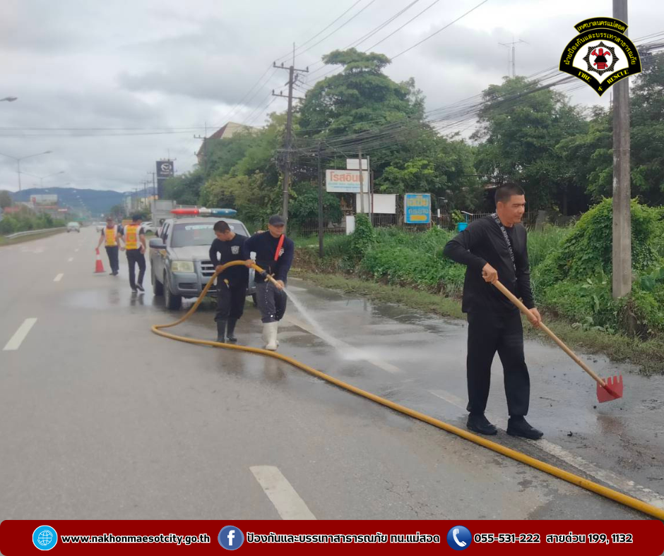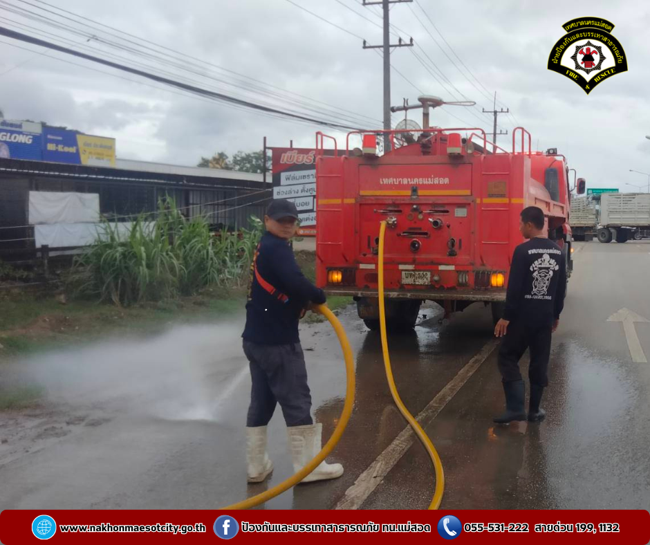วันพฤหัสบดีที่ 18 กรกฎาคม 2567 เวลา 13.30 น. ดับเพลิงนครแม่สอด นำรถยนต์บรรทุกน้ำดับเพลิง จำนวน 1 คัน ออกดำเนินการฉีดล้างทำความสะอาด บริเวณถนนสายเอเซีย แยกเอเซียการยาง อำเภอแม่สอด จังหวัดตาก ตามคำร้องขอความอนุเคราะห์ฯ เพื่อขจัดเศษ หิน ดิน ทราย รวมถึงสิ่งปนเปื้อนบนพื้นผิวถนน