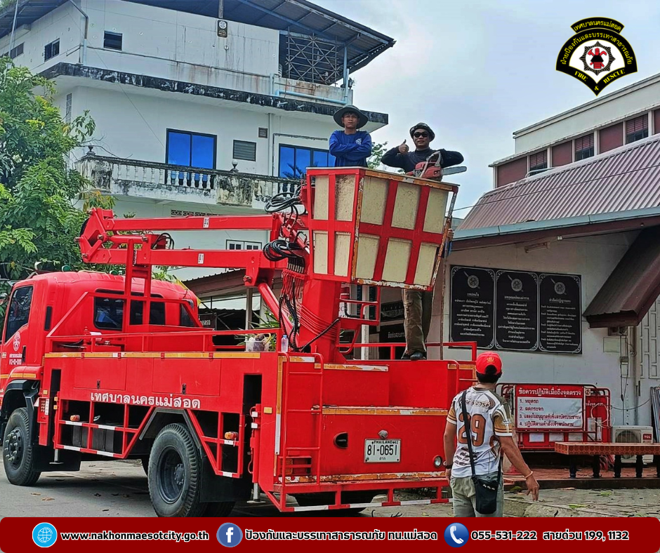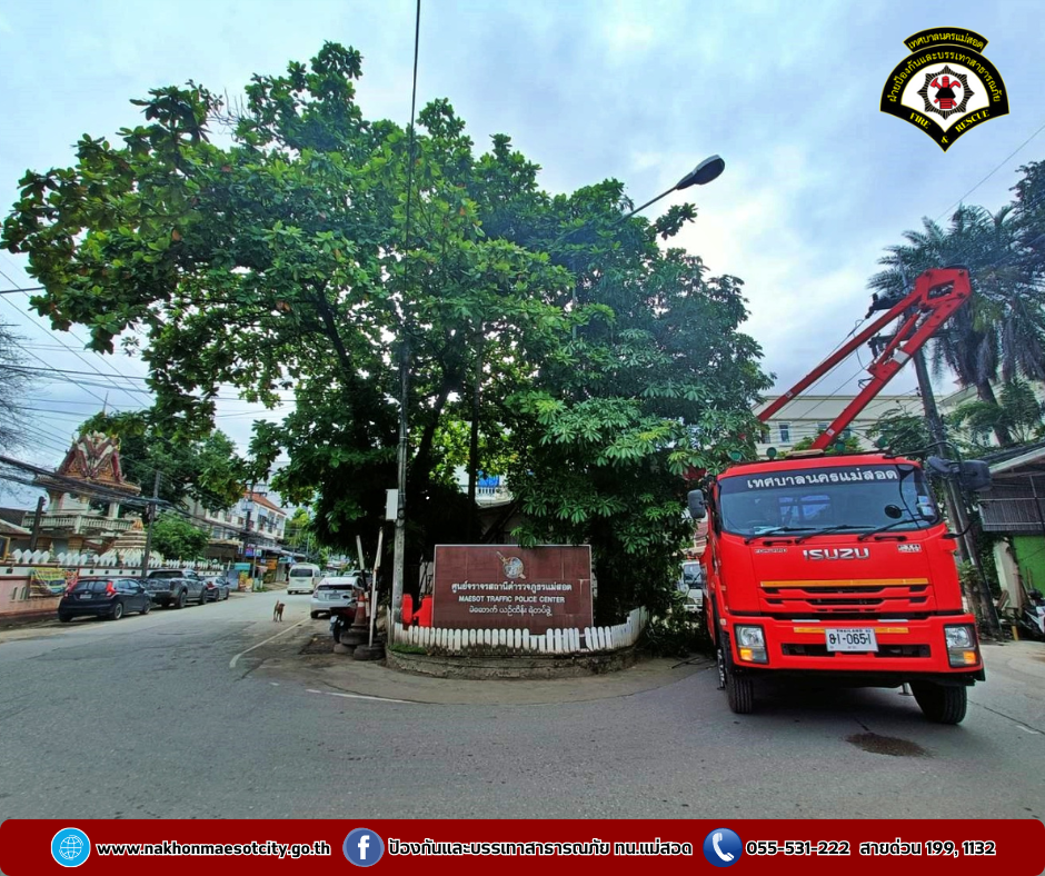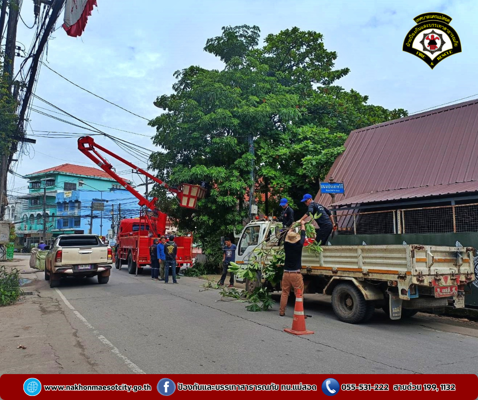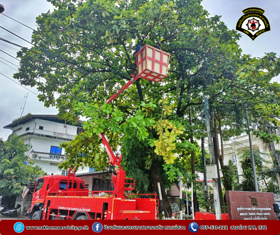 ดับเพลิงนครแม่สอด จึงนำรถยนต์บรรทุก 6 ล้อ และรถบรรทุกกระเช้าไฟฟ้า พร้อมอุปกรณ์ ออกดำเนินการตัดแต่งกิ่งไม้ดังกล่าว โดยใช้เลื่อยโซ่ยนต์ และใช้มีด ดำเนินการตัดจนแล้วเสร็จ พร้อมยกใส่รถยนต์บรรทุก 6 ล้อ ดำเนินการนำกิ่งไม้ไปทิ้งต่อไป เพื่อความเป็นระเบียบเรียบร้อย ความปลอดภัยต่อผู้ใช้รถใช้ถนน บริเวณดังกล่าว