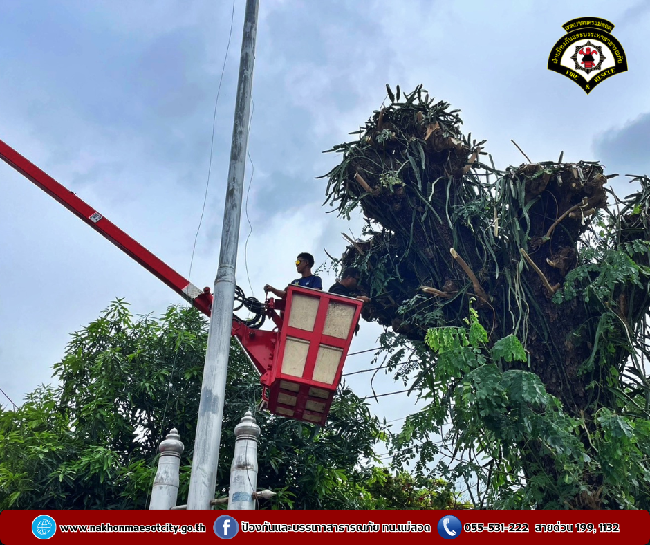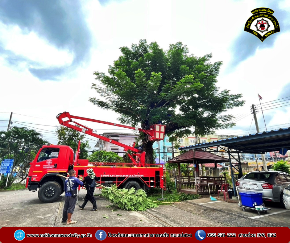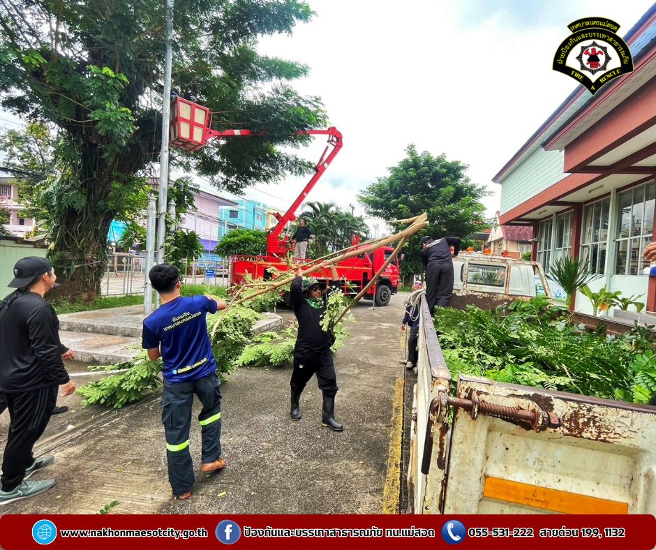 ดับเพลิงนครแม่สอด จึงนำรถยนต์บรรทุก 6 ล้อ และรถบรรทุกกระเช้าไฟฟ้า พร้อมอุปกรณ์ ออกดำเนินการตัดแต่งกิ่งไม้ดังกล่าว โดยใช้เลื่อยโซ่ยนต์ และใช้มีด ดำเนินการตัดจนแล้วเสร็จ พร้อมยกใส่รถยนต์บรรทุก 6 ล้อ ดำเนินการนำกิ่งไม้ไปทิ้งต่อไป เพื่อความเป็นระเบียบเรียบร้อย ความปลอดภัยต่อผู้ใช้รถใช้ถนน บริเวณดังกล่าว