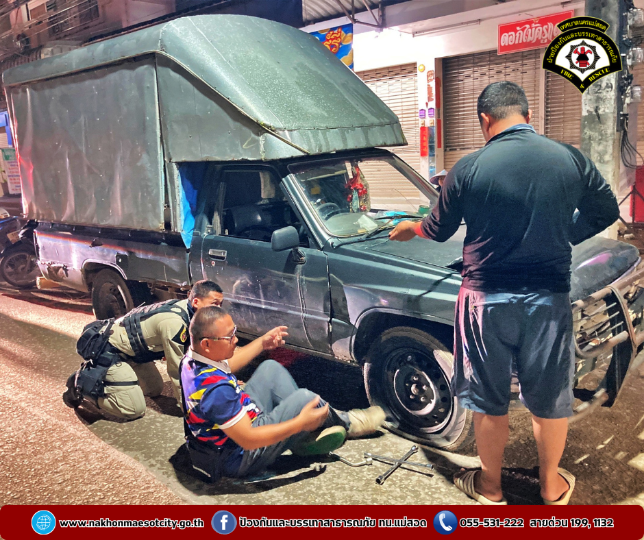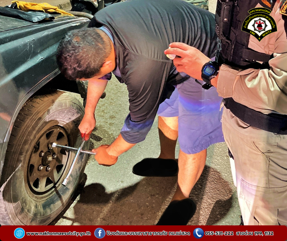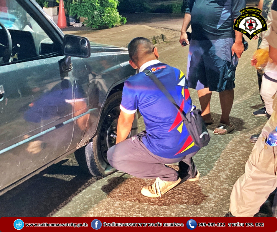 ดับเพลิงนครแม่สอด จึงได้นำรถยนต์กู้ภัยเคลื่อนที่เร็ว และอุปกรณ์สำหรับเปลี่ยนยางรถ ร่วมอาสาสมัครป้องกันภัยฝ่ายพลเรือน ออกตรวจสอบ ณ ที่เกิดเหตุ พอถึงที่เกิดเหตุพบรถยนต์กระบะ (ตู้ทึบ) ยี่ห้อโตโยต้า จอดรอการช่วยเหลือ พนักงานดับเพลิงจึงได้ทำการช่วยเหลือ โดยการเปลี่ยนยางรถ จนดำเนินการเเล้วเสร็จ