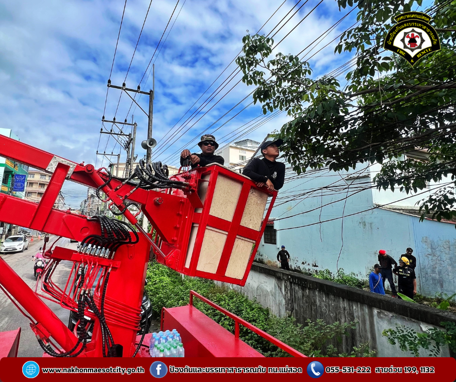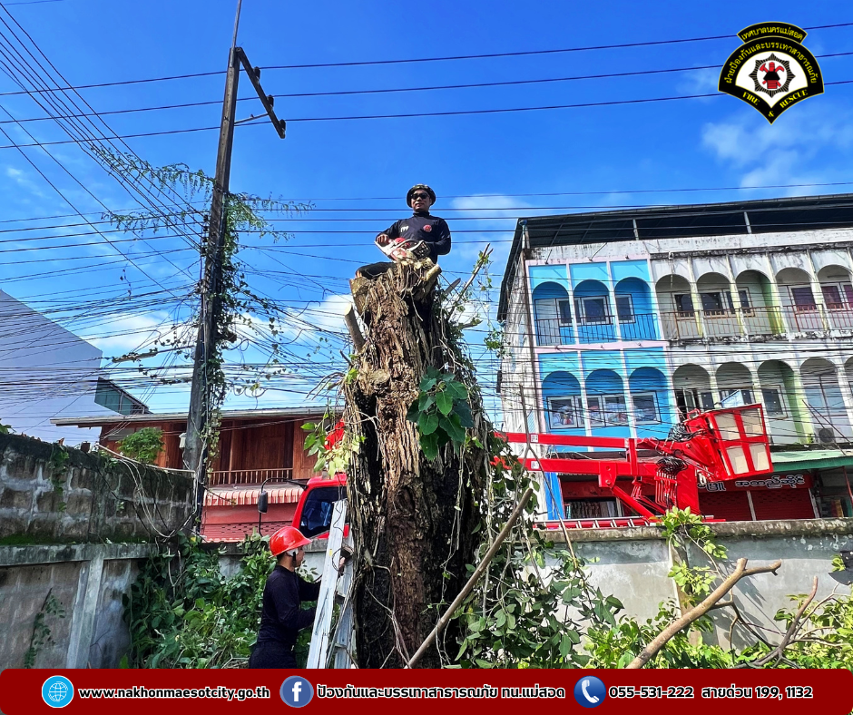 ดับเพลิงนครแม่สอด จึงนำรถยนต์บรรทุก 6 ล้อ และรถบรรทุกกระเช้าไฟฟ้า พร้อมอุปกรณ์ ดำเนินการตัดต้นไม้ดังกล่าว โดยใช้เลื่อยโซ่ยนต์ และใช้มีด ดำเนินการตัดจนแล้วเสร็จ พร้อมยกใส่รถยนต์บรรทุก 6 ล้อ ดำเนินการนำกิ่งไม้ไปทิ้งต่อไป เพื่อความเป็นระเบียบเรียบร้อย ความปลอดภัยต่อผู้ใช้รถใช้ถนน บริเวณดังกล่าว