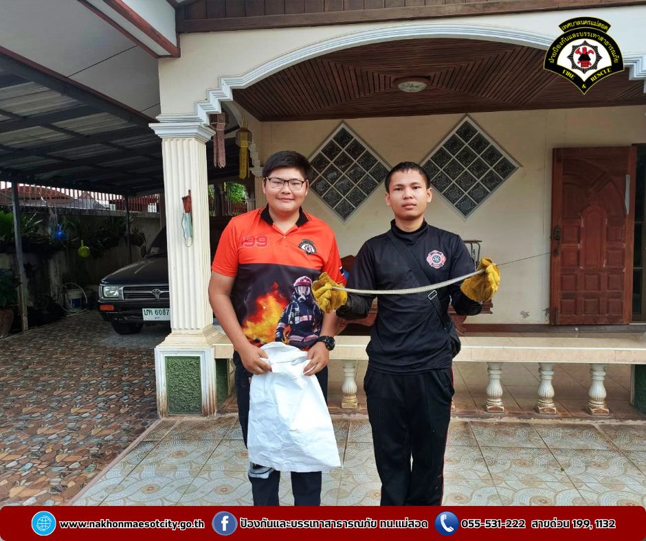 ดับเพลิงนครแม่สอด จึงได้นำรถยนต์ตรวจการณ์เคลื่อนที่เร็ว และอุปกรณ์สำหรับจับสัตว์เลื้อยคลาน ออกตรวจสอบ ณ ที่เกิดเหตุ พบสัตว์เลื้อยคลาน (งู) จึงได้ดำเนินการจับ และได้นำไปปล่อยคืนสู่ธรรมชาติ พื้นที่ห่างไกลชุมชนต่อไป