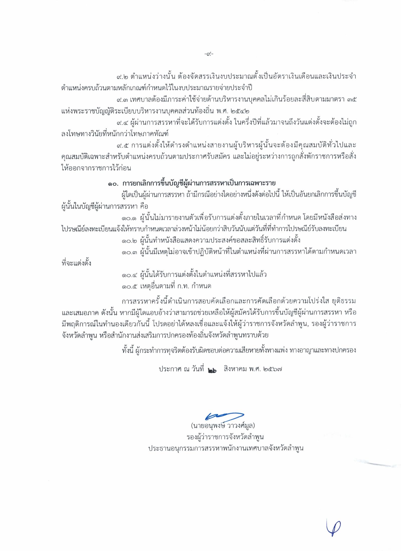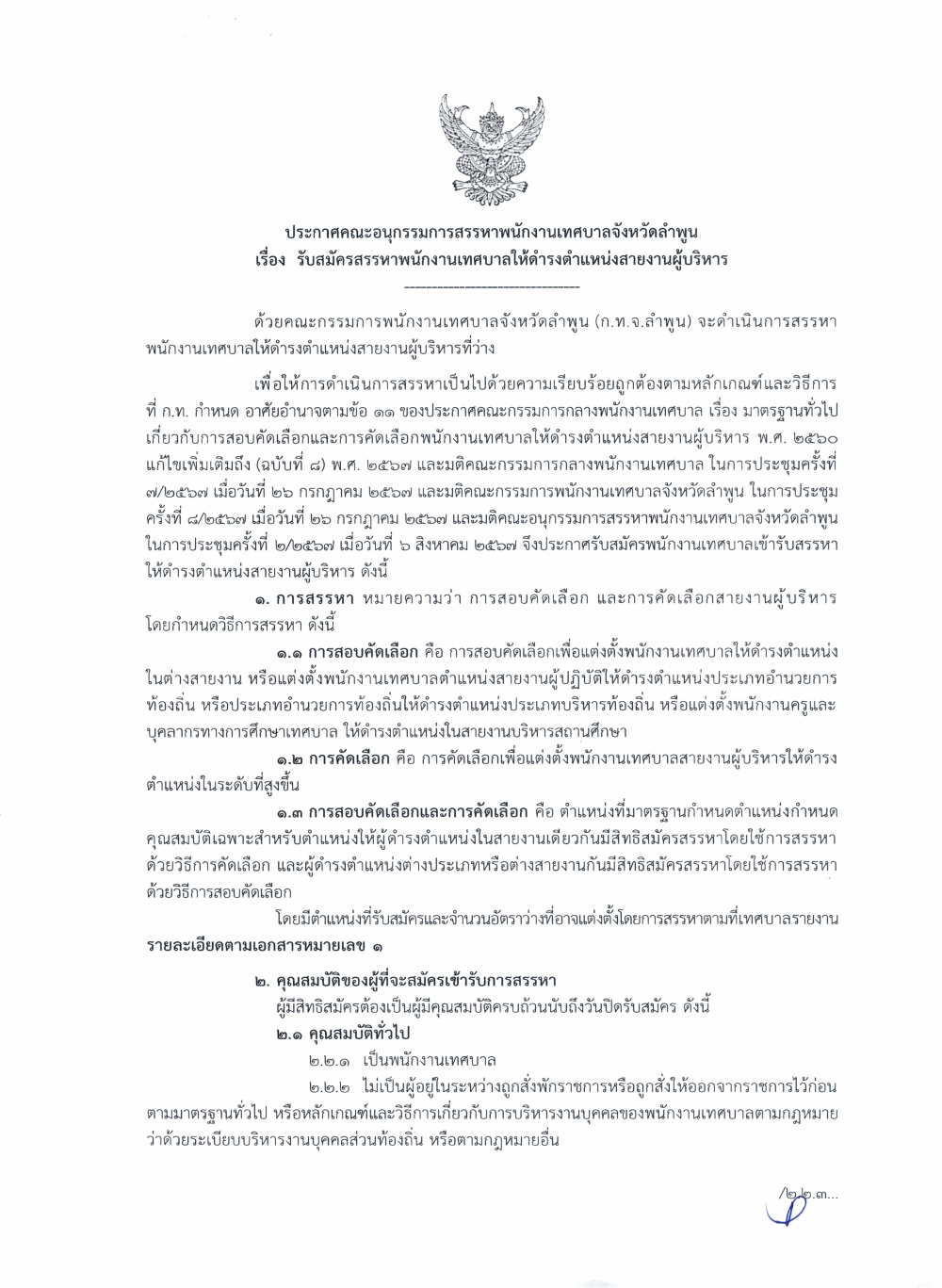 การรับสมัครสรรหาพนักงานเทศบาลให้ดำรงตำแหน่งสายงานบริหาร จังหวัดลำพูน