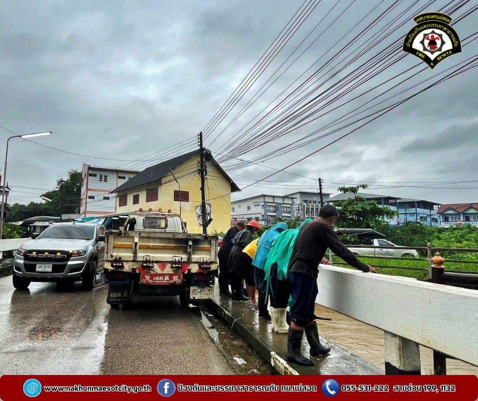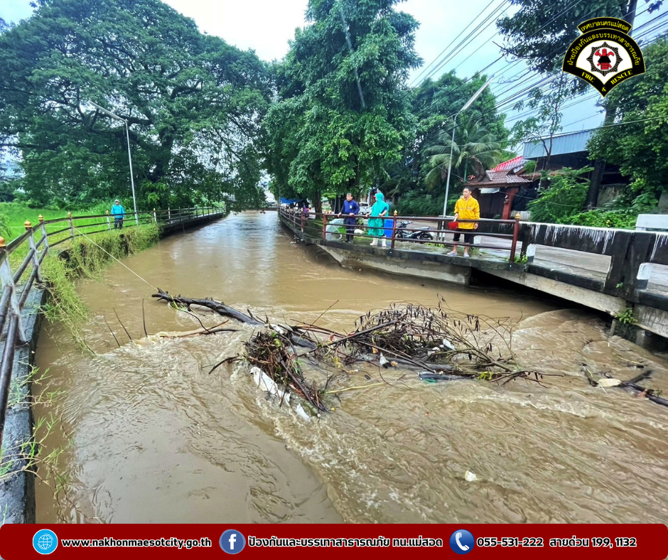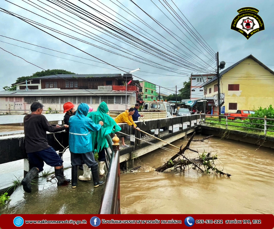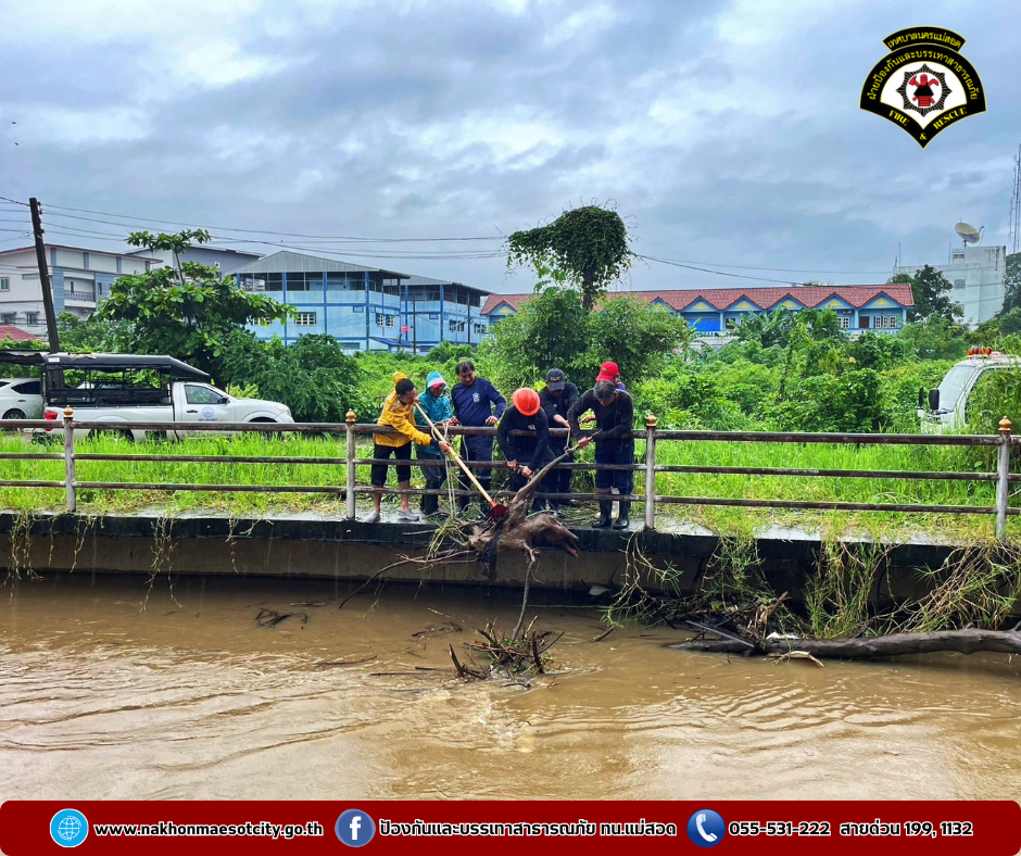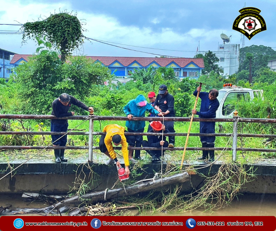 วันอังคารที่ 10 กันยายน 2567 เวลา 16.50 น. ว่าที่ร้อยตรี ประเสริฐ ปวงละคร นายกเทศมนตรีนครแม่สอด มอบหมายให้ดับเพลิงนครแม่สอด นำรถยนต์บรรทุก 6 ล้อ รถยนต์ตรวจการณ์ และรถยนต์กู้ภัยเคลื่อนที่เร็ว พร้อมอุปกรณ์ ออกดำเนินการเก็บกิ่งไม้ขึ้นมาจากคลองแม่สอด เพื่อไม่ให้ขวางทางไหลคลองน้ำ และเพื่อความสะอาด สวยงามของพื้นที่ รวมถึงการป้องกันน้ำท่วมเอ่อล้นสะพาน บริเวณสะพานจ๊อกจอ อำเภอแม่สอด จังหวัดตาก