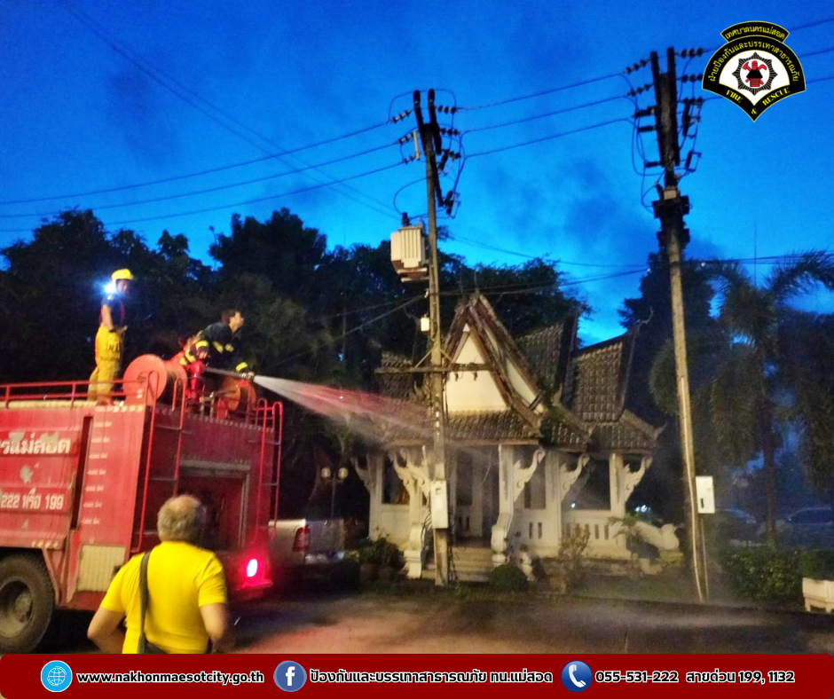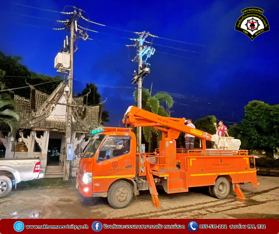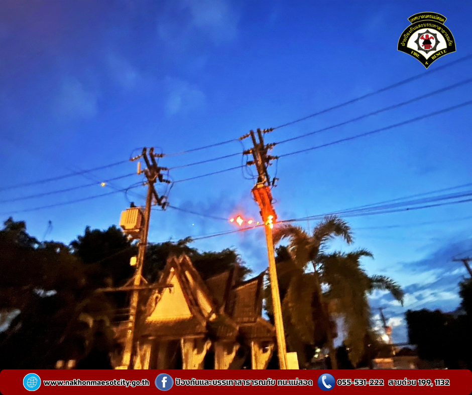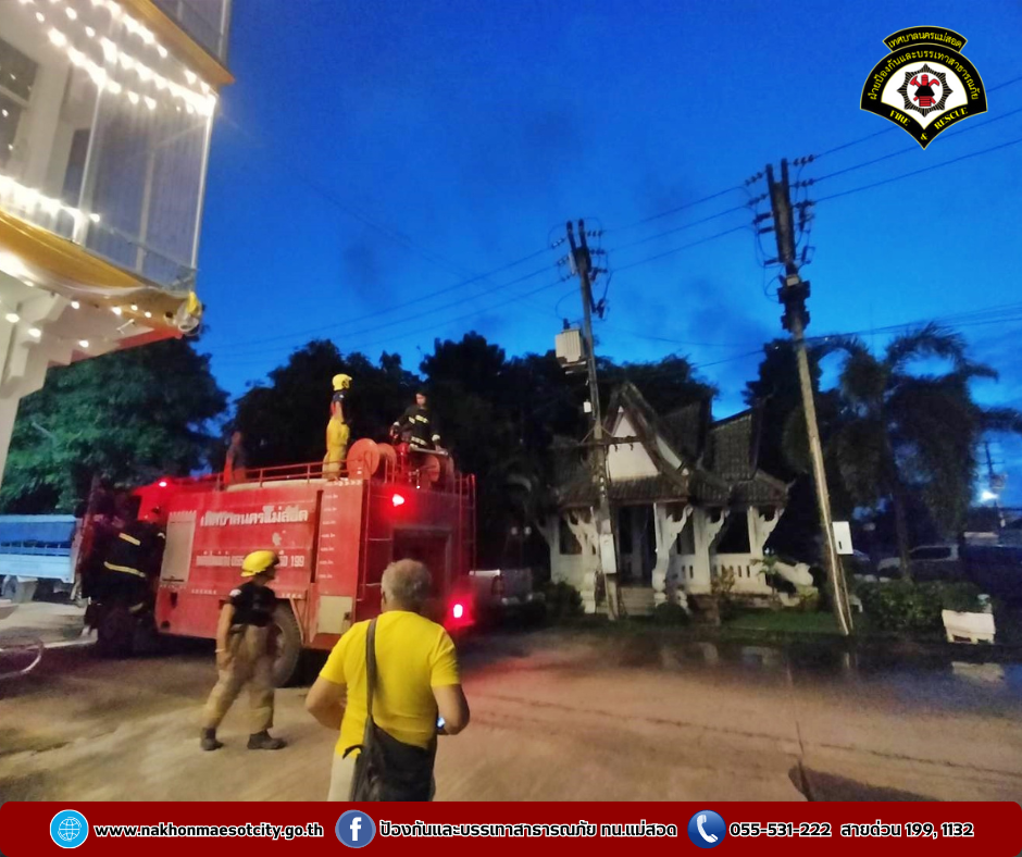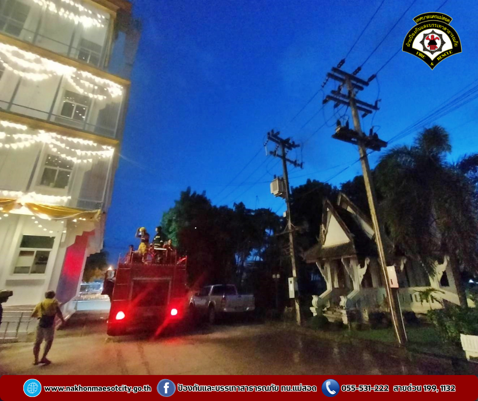ฝ่ายป้องกันและบรรเทาสาธารณภัย เทศบาลนครแม่สอด จึงรายงานว่าที่ร้อยตรีประเสริฐ ปวงละคร นายกเทศมนตรีนครแม่สอด ทราบ และได้นำรถยนต์บรรทุกน้ำดับเพลิง จำนวน 1 คัน พร้อมนักผจญเพลิง ร่วมกับเจ้าหน้าที่การไฟฟ้าแม่สอด ออกตรวจสอบ ณ ที่เกิดเหตุ