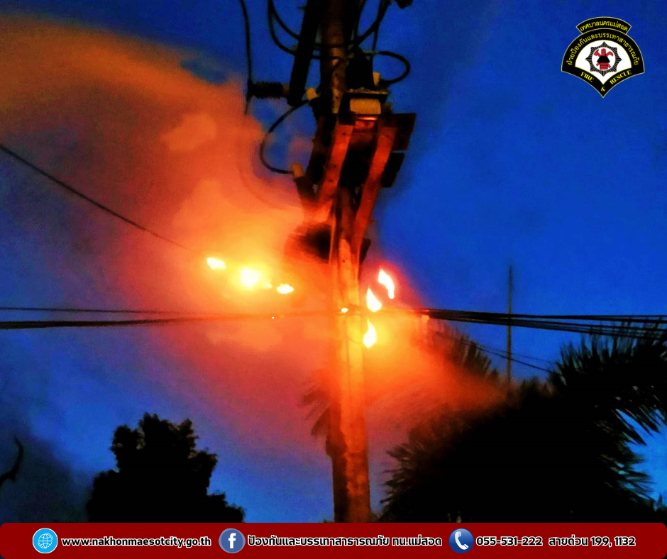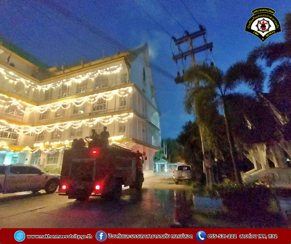 วันศุกร์ที่ 13 กันยายน 2567 เวลา 18.49 น. ฝ่ายป้องกันและบรรเทาสาธารณภัย เทศบาลนครแม่สอด ได้รับแจ้งจากอาสาสมัครป้องกันภัยฝ่ายพลเรือน เทศบาลนครแม่สอด ว่ามีเหตุเพลิงไหม้สายไฟฟ้า บริเวณใกล้เคียงหอพระพุทธรูป ภายในสำนักงานเทศบาลนครแม่สอด อำเภอแม่สอด จังหวัดตาก