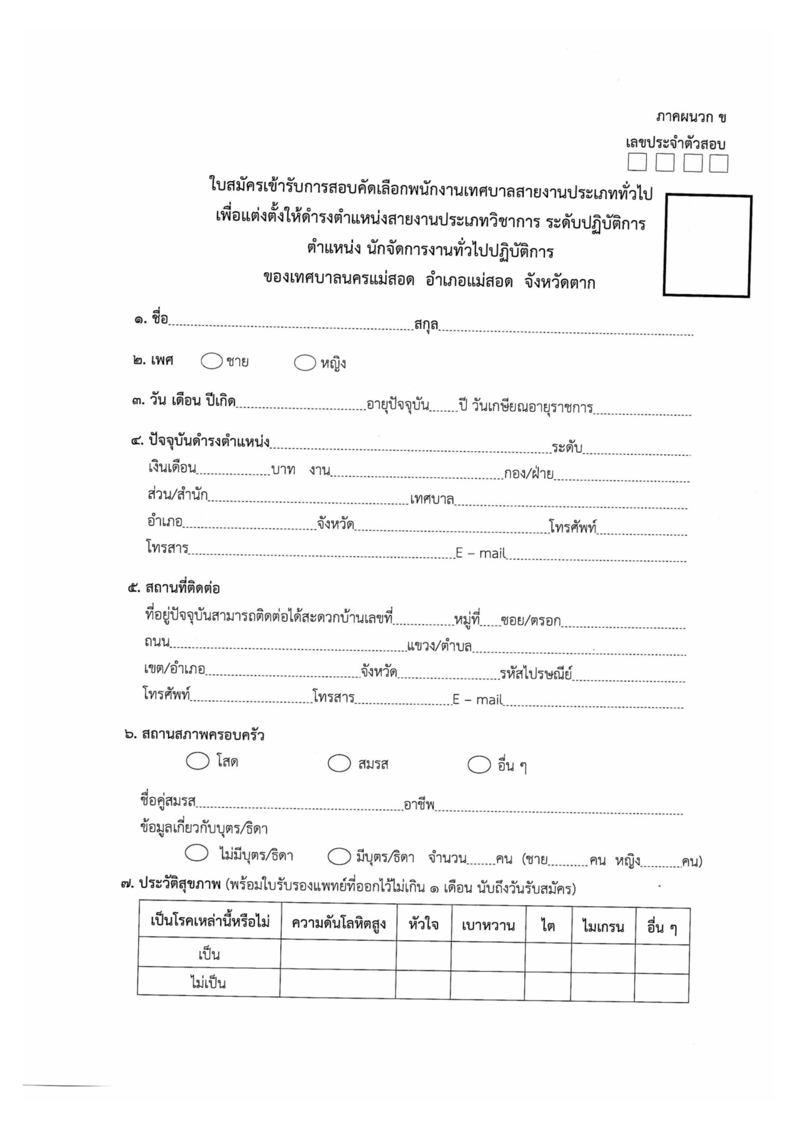 ประกาศเทศบาลนครแม่สอด เรื่อง รับสมัครสอบคัดเลือกพนักงานเทศบาลสายงานประเภททั่วไป เพื่อแต่งตั้งให้ดำรงตำแหน่งสายงานประเภทวิชาการ ระดับปฏิบัติการ