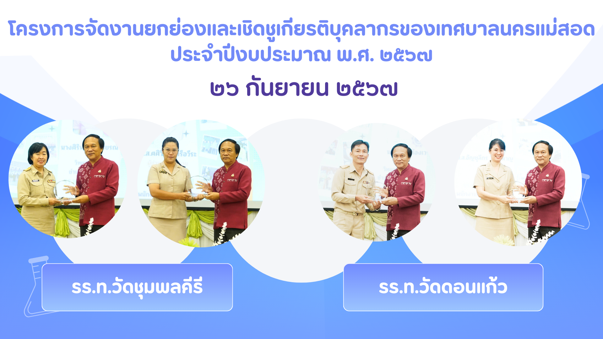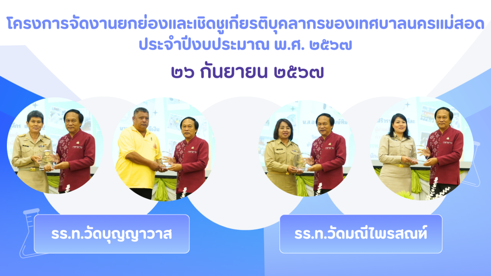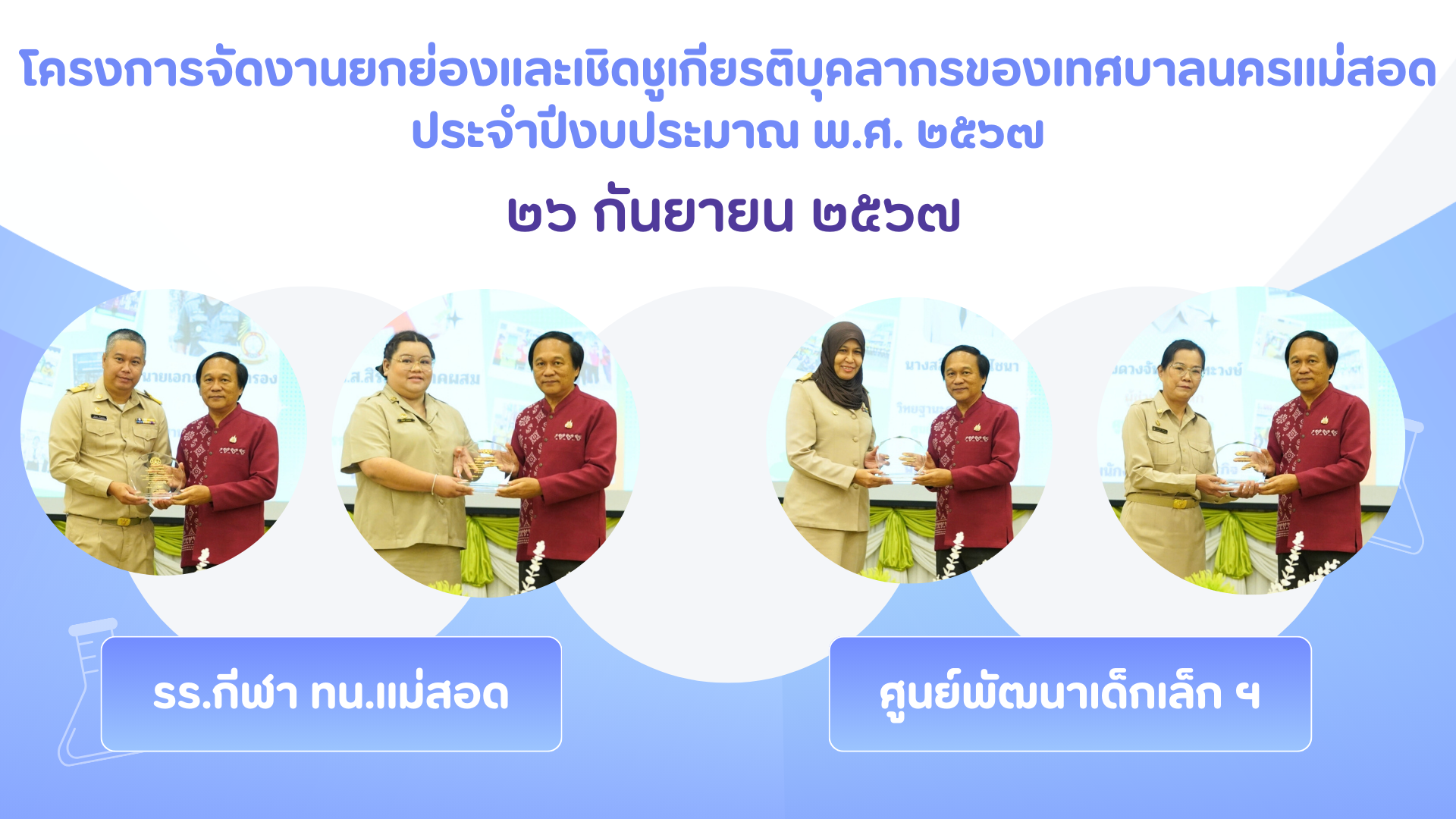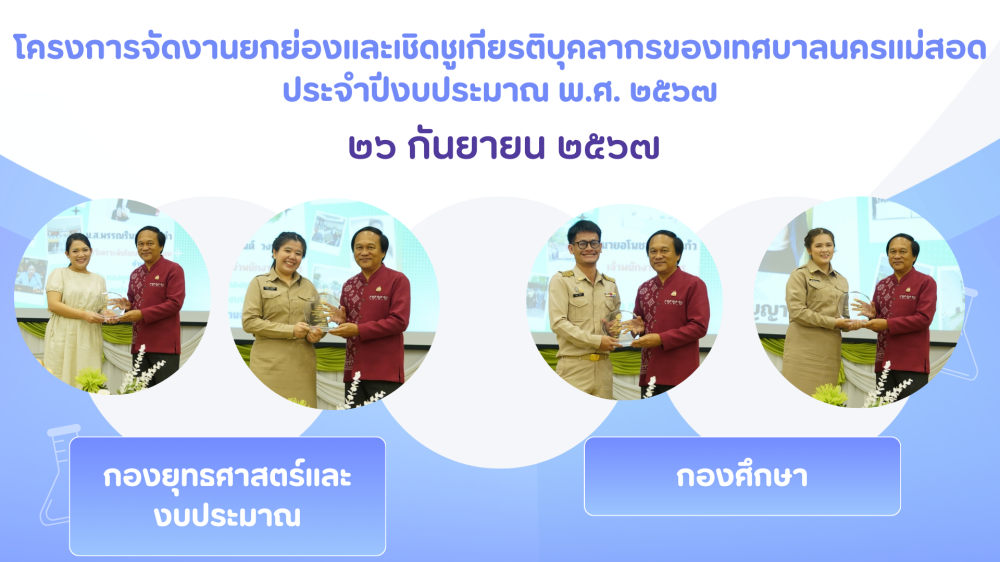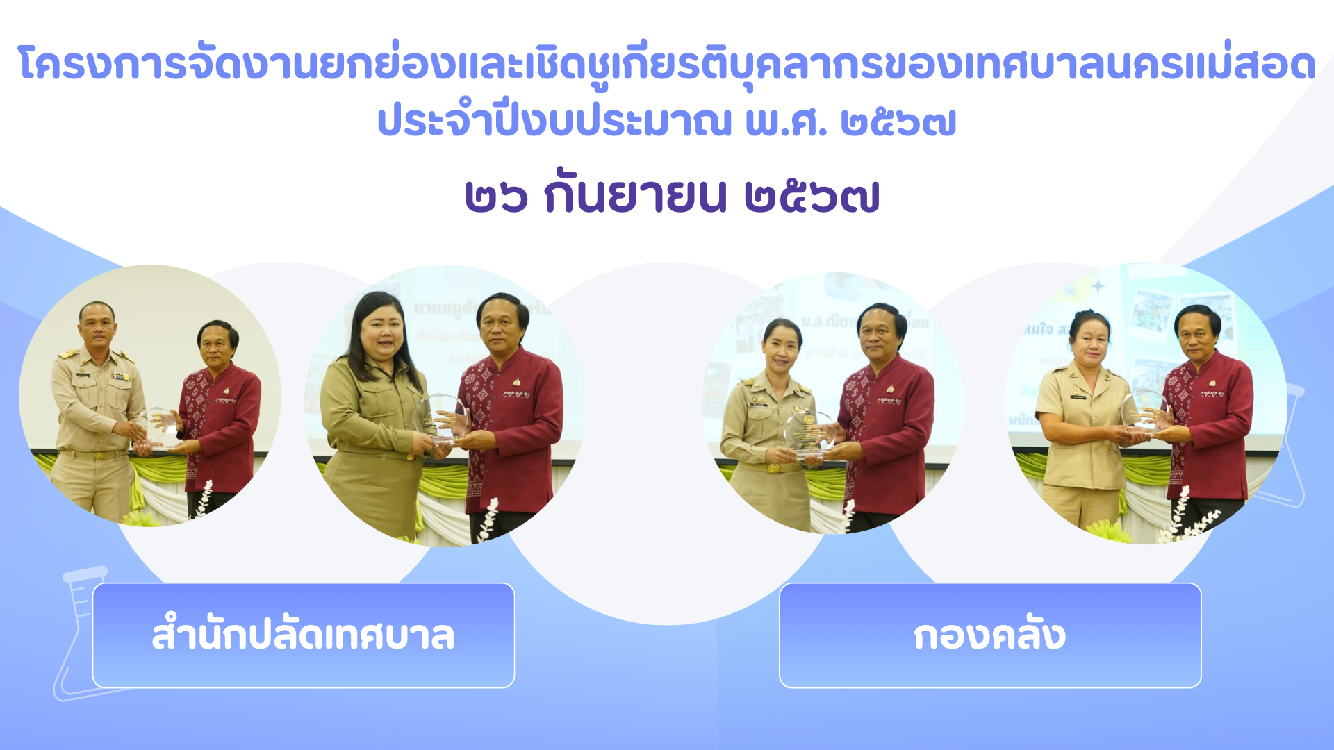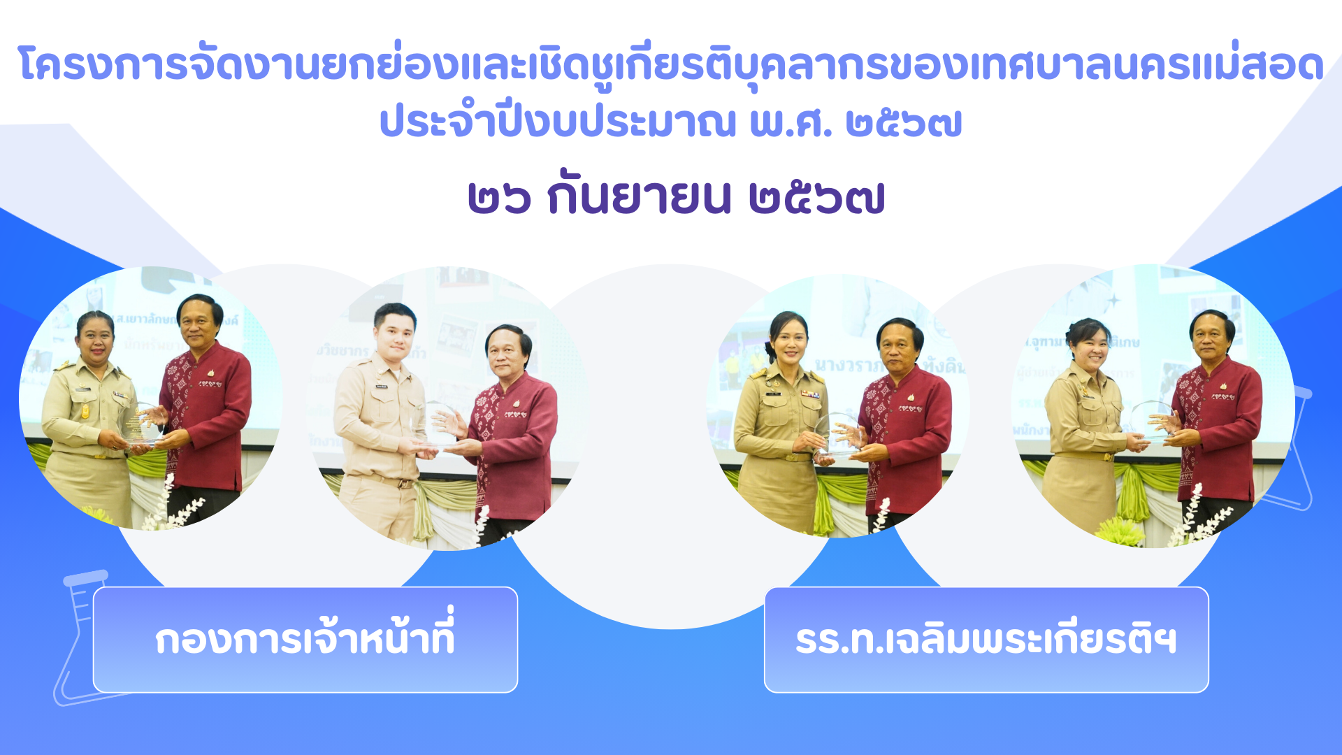 เมื่อวันที่ 26 กันยายน 2567 เวลา 08.00 น. กองการเจ้าหน้าที่ ได้รับเกียรติจาก ว่าที่ร้อยตรีประเสริฐ ปวงละคร นายกเทศมนตรีนครแม่สอด เป็นประธาน เปิดโครงการจัดงานยกย่องและเชิดชูเกียรติบุคลากรของเทศบาลนครแม่สอด ประจำปีงบประมาณ 2567