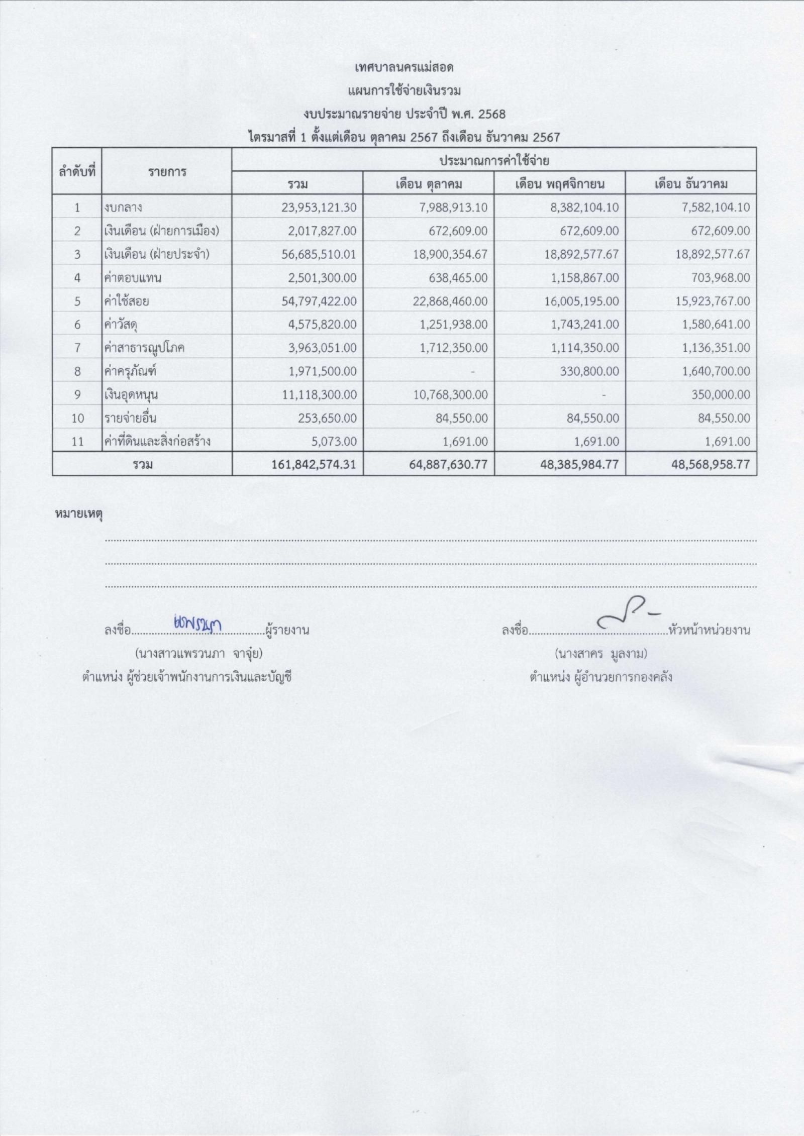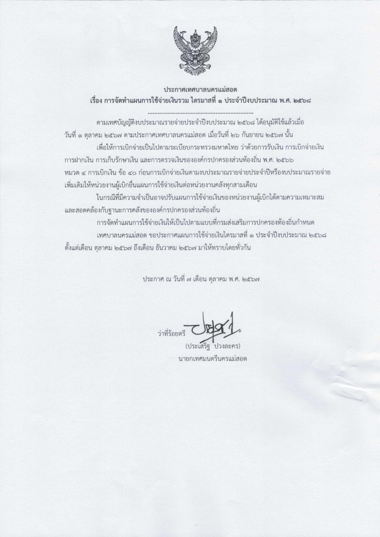 ประกาศเทศบาลนครแม่สอด เรื่อง การจัดทำแผนการใช้จ่ายเงินรวม ไตรมาสที่ 1 ประจำปีงบประมาณ พ.ศ. 2568
