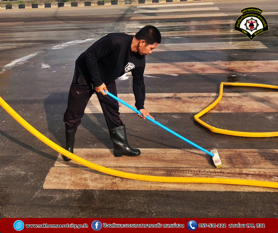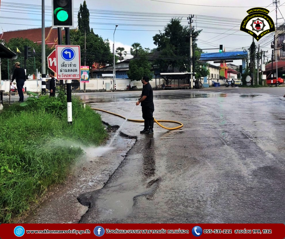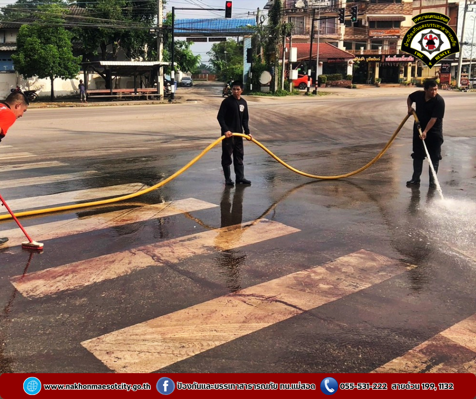 วันอาทิตย์ที่ 6 ตุลาคม 2567 เวลา 09.00 น. ว่าที่ร้อยตรี ประเสริฐ ปวงละคร นายกเทศมนตรีนครแม่สอด มอบหมายให้ดับเพลิงนครแม่สอด นำรถยนต์บรรทุกน้ำดับเพลิง จำนวน 1 คัน พร้อมเจ้าหน้าที่ ออกดำเนินการฉีดล้างทำความสะอาดถนน เนื่องจากถนนลื่น บริเวณแยกดอนแก้ว ตำบลแม่สอด อำเภอแม่สอด จังหวัดตาก เพื่อเป็นการทำความสะอาด ระเบียบเรียบร้อย