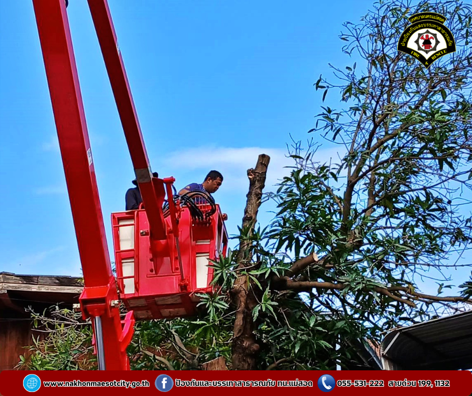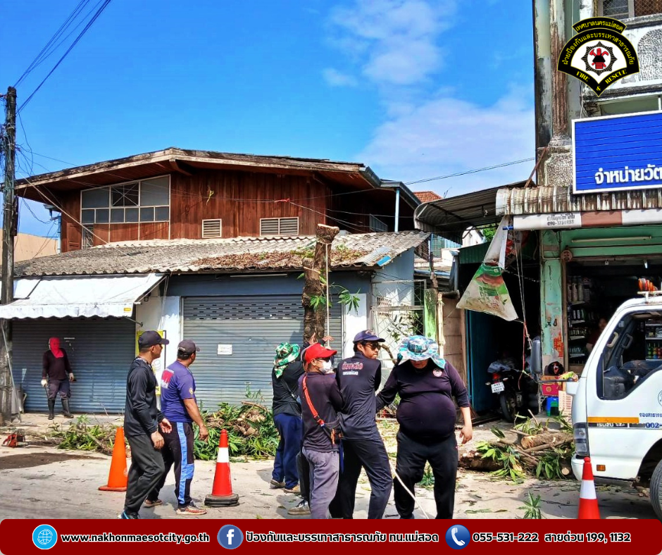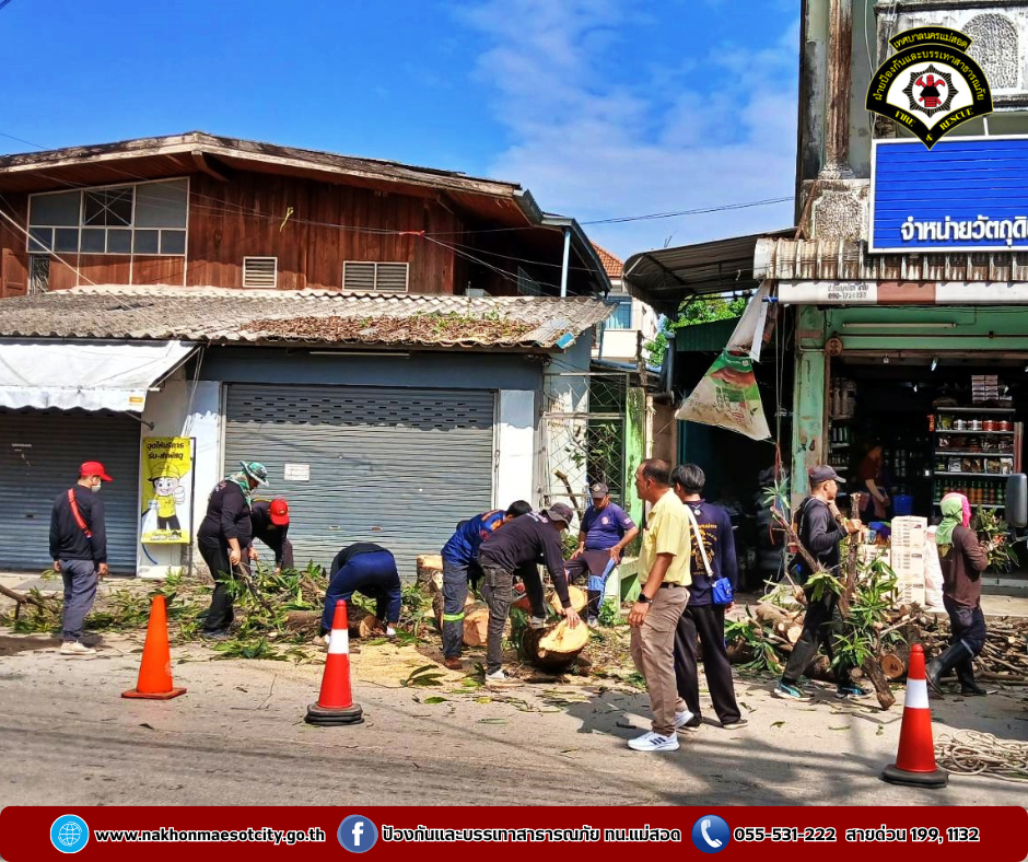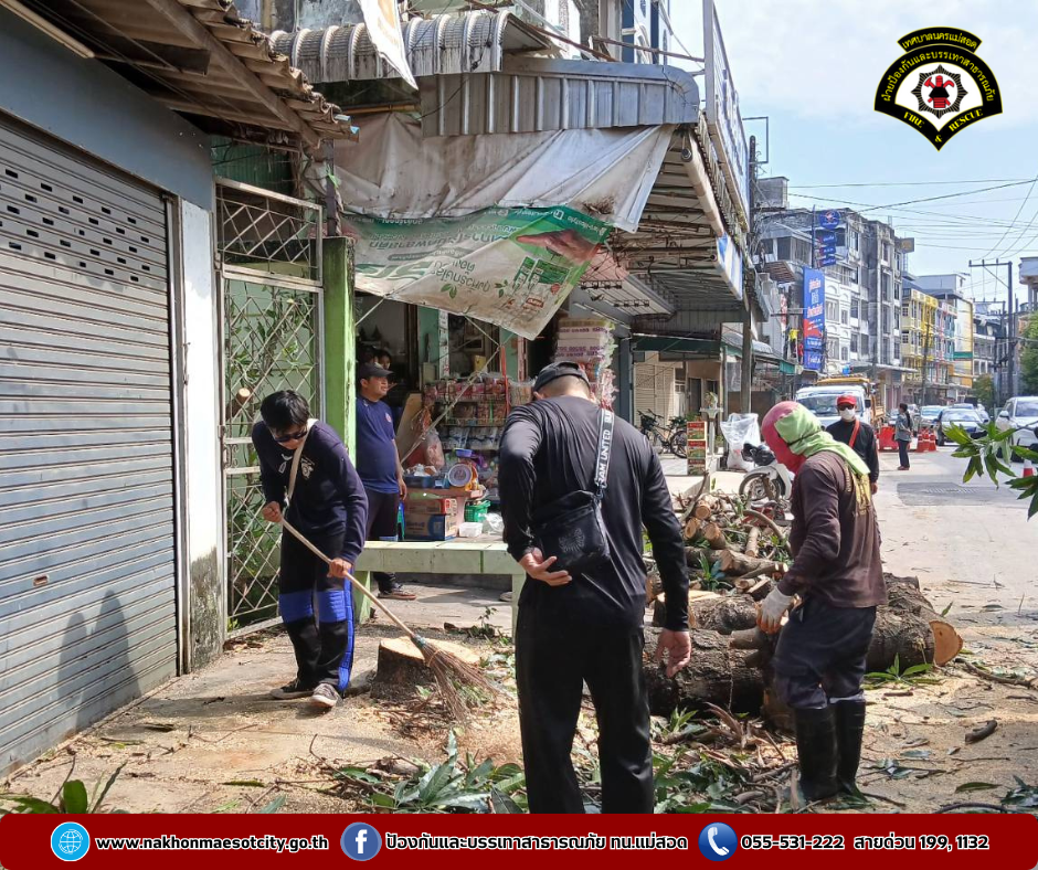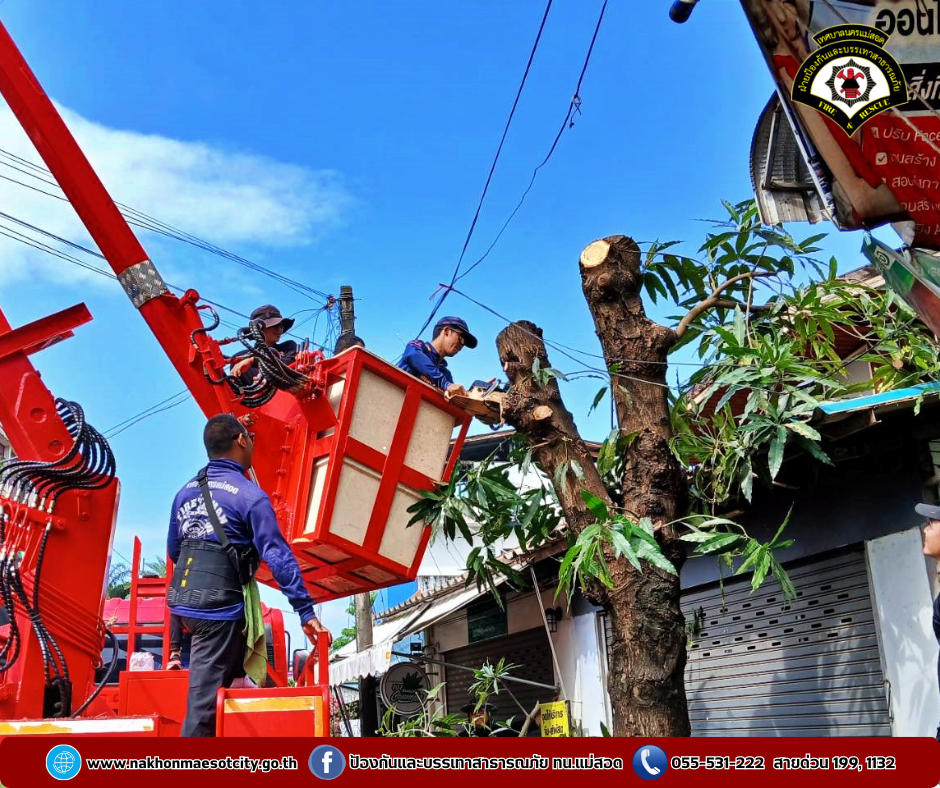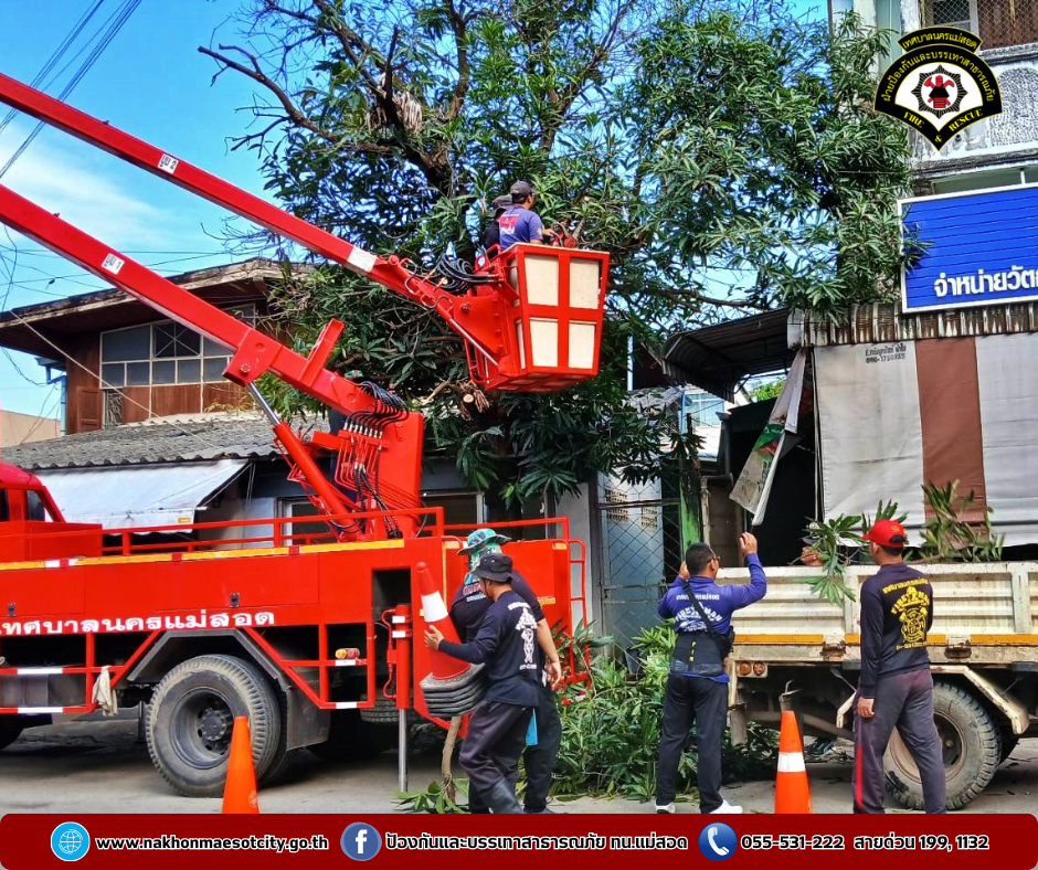 ดับเพลิงนครแม่สอด จึงนำรถยนต์บรรทุก 6 ล้อ และรถบรรทุกกระเช้าไฟฟ้า พร้อมอุปกรณ์ ดำเนินการตัดต้นไม้ดังกล่าว โดยใช้เลื่อยโซ่ยนต์ และใช้มีด ดำเนินการตัดจนแล้วเสร็จ พร้อมยกใส่รถยนต์บรรทุก 6 ล้อ ดำเนินการนำกิ่งไม้ไปทิ้งต่อไป เพื่อความเป็นระเบียบเรียบร้อย และความปลอดภัย บริเวณดังกล่าว