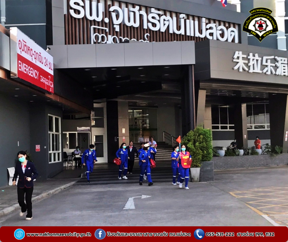 ซึ่งการฝึกซ้อมแผนฯ สมมติสถานการณ์เหตุเพลิงไหม้ที่ตู้นึ่งเครื่องมือแพทย์ ภายในแผนกจ่ายกลาง ชั้น 2 ดำเนินการช่วยเหลือโดยใช้รถยนต์บรรทุกน้ำดับเพลิง ระงับเหตุเพลิงไหม้ การไฟฟ้าตัดกระแสไฟ ทดสอบระบบหัวรับน้ำ และ Fire Pump ของโรงพยาบาลแม่สอด มีผู้เข้าร่วมการฝึกอพยพ จำนวน 200 คน