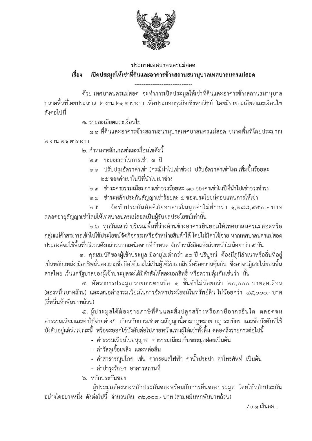 ประกาศเทศบาลนครแม่สอด เรื่อง เปิดประมูลให้เช่าที่ดินและอาคารข้างสถานธนานุบาลเทศบาลนครแม่สอด