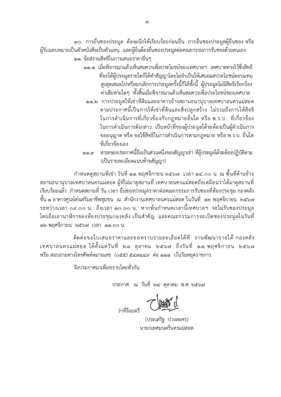 ประกาศเทศบาลนครแม่สอด เรื่อง เปิดประมูลให้เช่าที่ดินข้างสำนักงานการประปาส่วนภูมิภาค สาขา แม่สอด พื้นที่ B