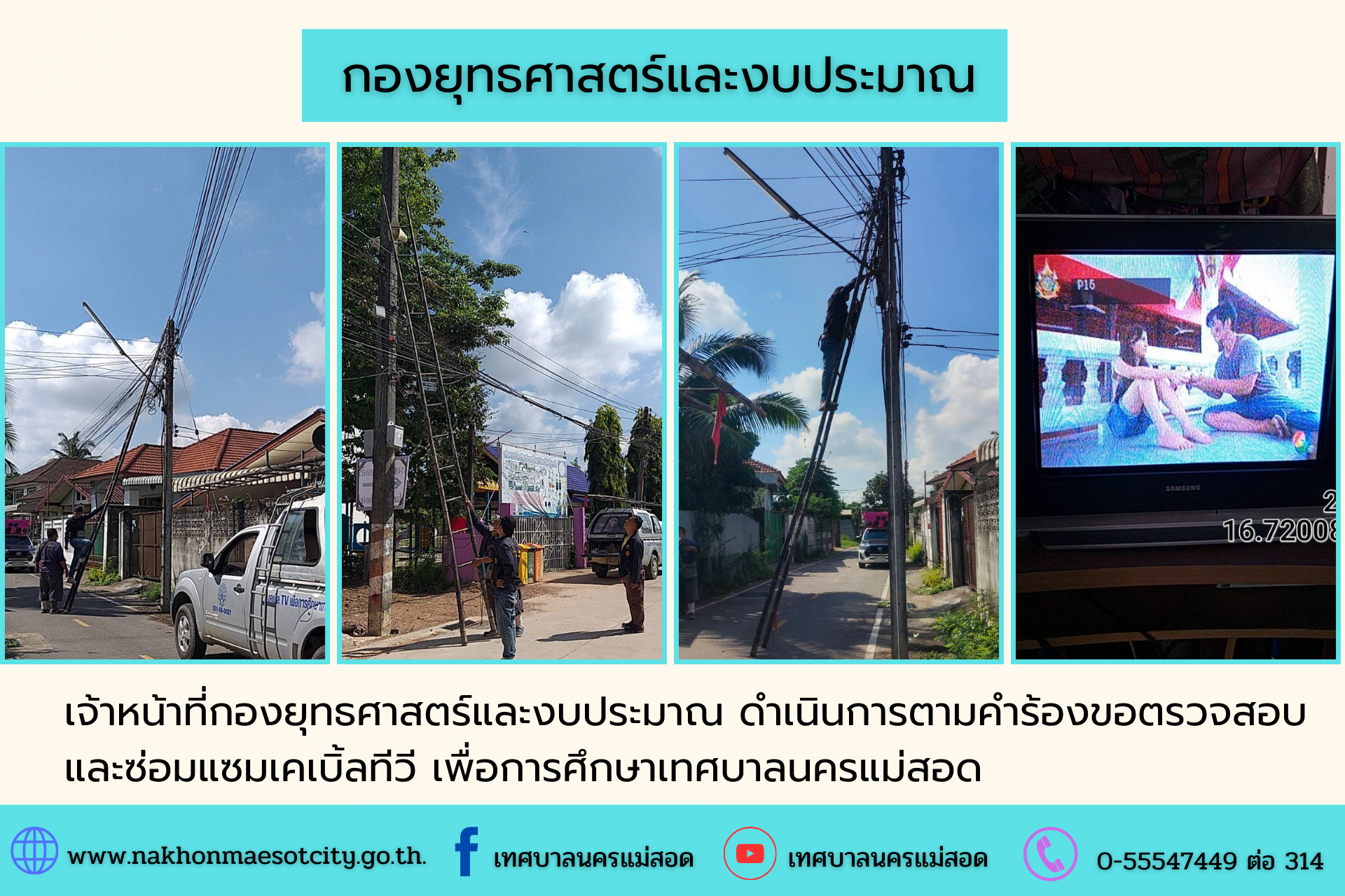 เมื่อศุกร์ ที่ 25 ตุลาคม 2567 ว่าที่พันตรี ดร.ไพฑูรย์ ปริญญาธรรมกุล ผู้อำนวยการกองยุทธศาสตร์และงบประมาณ มอบหมายให้ เจ้าหน้าที่ฝ่ายวิเทศสัมพันธ์ กองยุทธศาสตร์และงบประมาณ ลงพื้นที่ดำเนินการตรวจสอบและซ่อมแซมเคเบิ้ลทีวี เพื่อการศึกษาเทศบาลนครแม่สอด