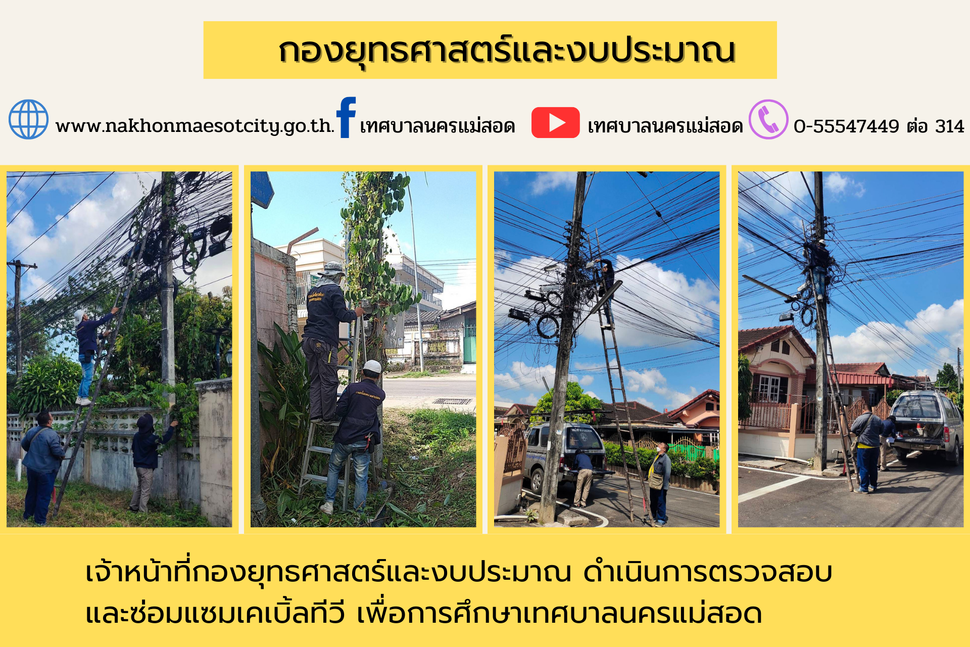 เมื่อจันทร์ ที่ 28 ตุลาคม 2567 ว่าที่พันตรี ดร.ไพฑูรย์ ปริญญาธรรมกุล ผู้อำนวยการกองยุทธศาสตร์และงบประมาณ มอบหมายให้ เจ้าหน้าที่ฝ่ายวิเทศสัมพันธ์ กองยุทธศาสตร์และงบประมาณ ลงพื้นที่ดำเนินการตรวจสอบและซ่อมแซมเคเบิ้ลทีวี เพื่อการศึกษาเทศบาลนครแม่สอด
