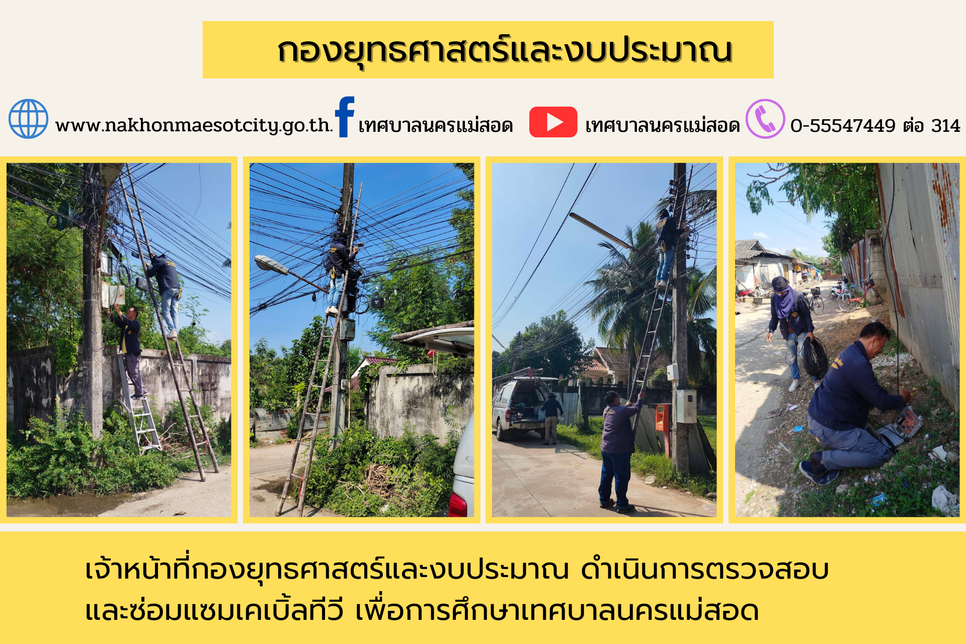 เมื่อจันทร์ ที่ 4 พฤศจิกายน 2567 ว่าที่พันตรี ดร.ไพฑูรย์ ปริญญาธรรมกุล ผู้อำนวยการกองยุทธศาสตร์และงบประมาณ มอบหมายให้ เจ้าหน้าที่ฝ่ายวิเทศสัมพันธ์ กองยุทธศาสตร์และงบประมาณ ลงพื้นที่ดำเนินการตรวจสอบและซ่อมแซมเคเบิ้ลทีวี เพื่อการศึกษาเทศบาลนครแม่สอด