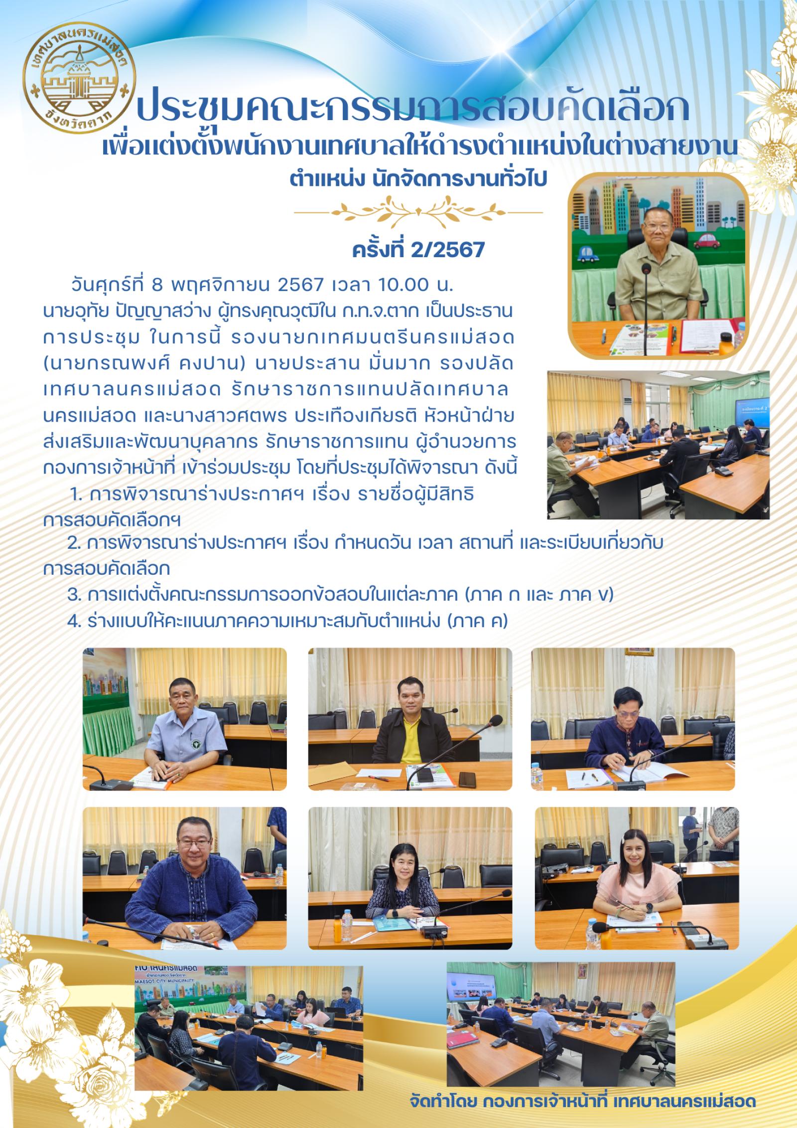 ประชุมคณะกรรมการสอบคัดเลือก เพื่อแต่งตั้งพนักงานเทศบาลให้ดำรงตำแหน่งในต่างสายงาน ตำแหน่ง นักจัดการงานทั่วไป ครั้งที่ 2/2567