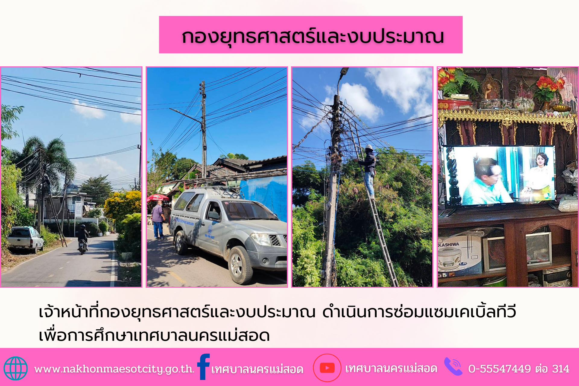 เมื่ออังคาร ที่ 19 พฤศจิกายน 2567 ว่าที่พันตรี ดร.ไพฑูรย์ ปริญญาธรรมกุล ผู้อำนวยการกองยุทธศาสตร์และงบประมาณ มอบหมายให้ เจ้าหน้าที่ฝ่ายวิเทศสัมพันธ์ กองยุทธศาสตร์และงบประมาณ ลงพื้นที่ดำเนินการตามคำร้องขอติดตั้งและซ่อมแซมเคเบิ้ลทีวี เพื่อการศึกษาเทศบาลนครแม่สอด