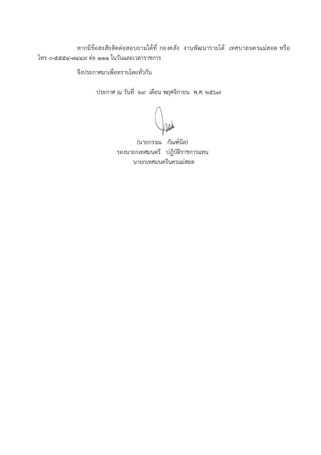 ประกาศเทศบาลนครแม่สอด เรื่อง ขยายเวลาการดำเนินการตามพระราชบัญญัติภาษีที่ดินและสิ่งปลูกสร้าง พ.ศ. 2562 ประจำปี พ.ศ. 2568
