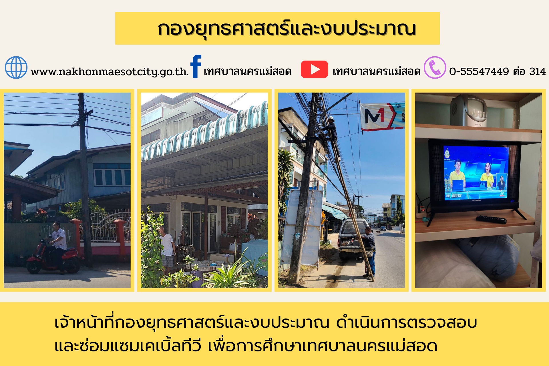 เมื่อวันจันทร์ ที่ 23 ธันวาคม 2567 ว่าที่พันตรี ดร.ไพฑูรย์ ปริญญาธรรมกุล ผู้อำนวยการกองยุทธศาสตร์และงบประมาณ มอบหมายให้ เจ้าหน้าที่ฝ่ายวิเทศสัมพันธ์ กองยุทธศาสตร์และงบประมาณ ลงพื้นที่ดำเนินการตามคำร้องขอติดตั้งและซ่อมแซมเคเบิ้ลทีวี เพื่อการศึกษาเทศบาลนครแม่สอด