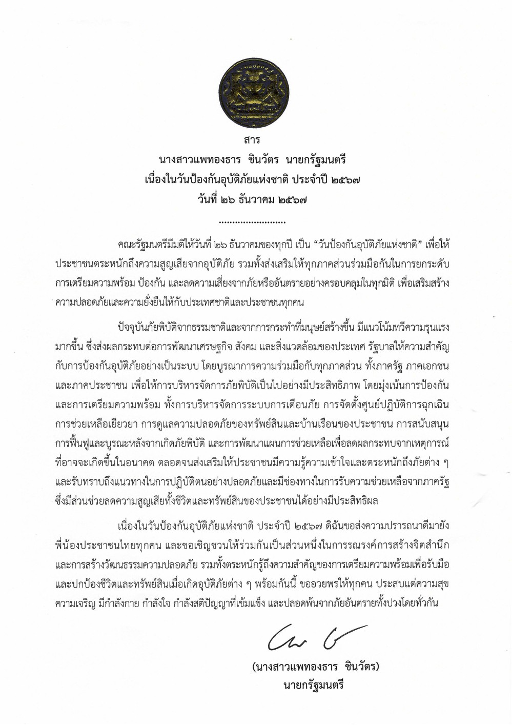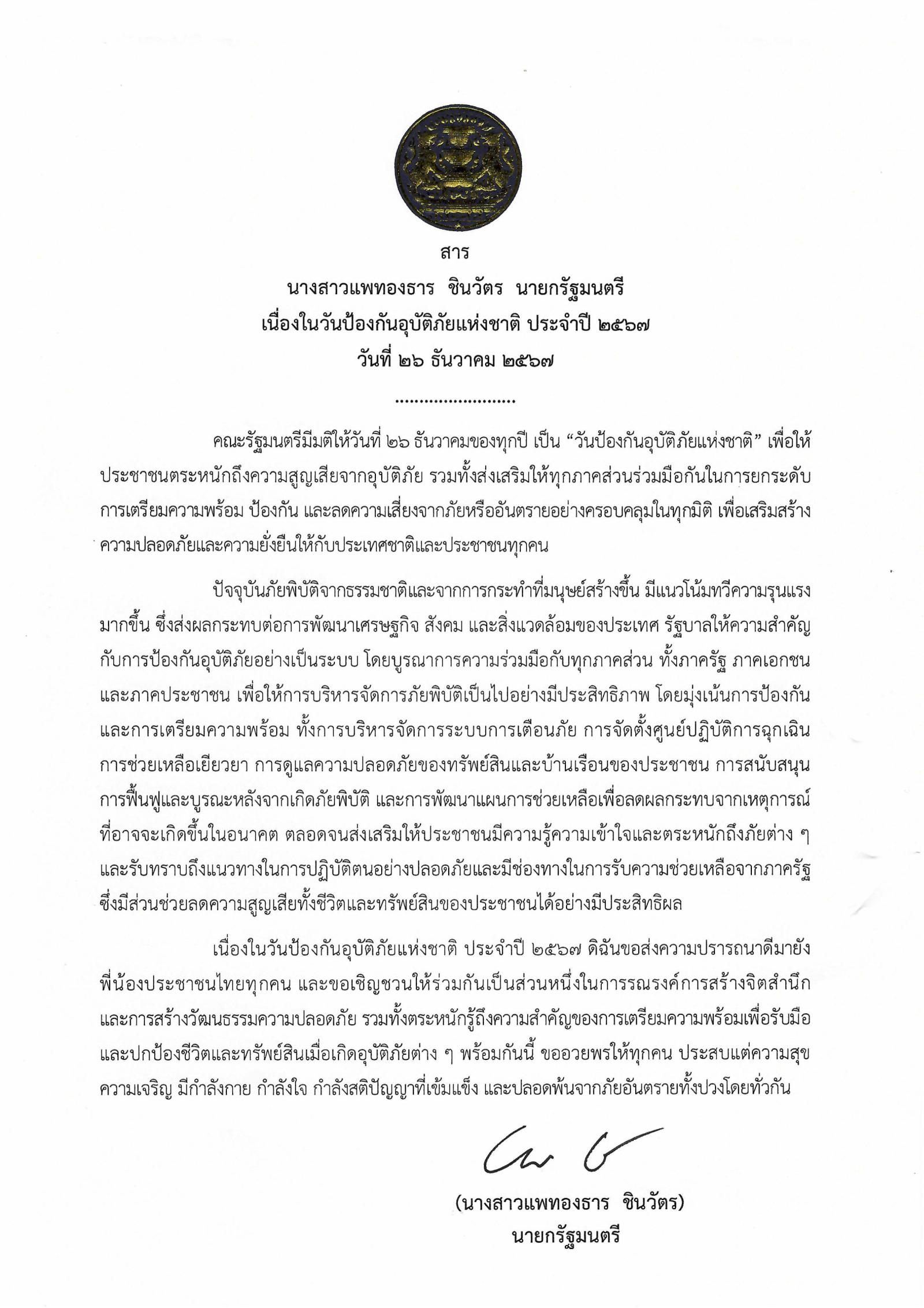 นางสาวแพทองธาร ชินวัตร นายกรัฐมนตรี มอบสาร "เนื่องในวันป้องกันอุบัติภัยแห่งชาติ ประจำปี 2567" วันที่ 26 ธันวาคม 2567
