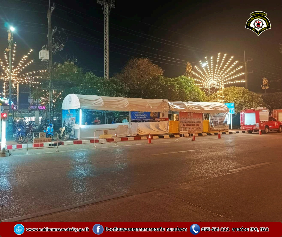 เมื่อวันอาทิตย์ที่ 29 ธันวาคม 2567 เวลา 08.00 น. - วันจันทร์ที่ 30 ธันวาคม 2567 เวลา 08.00 น. บรรยากาศการปฎิบัติหน้าที่ เข้าเวร ณ จุดบริการประชาชน ตามกิจกรรมป้องกันและลดอุบัติเหตุ ช่วงเทศกาลปีใหม่ ประจำปี 2568 ณ บริเวณหน้าสำนักงานเทศบาลนครแม่สอด ระหว่างวันที่ 27 ธันวาคม 2567 - 5 มกราคม 2568 (ช่วงควบคุมเข้มข้น 10 วัน)
