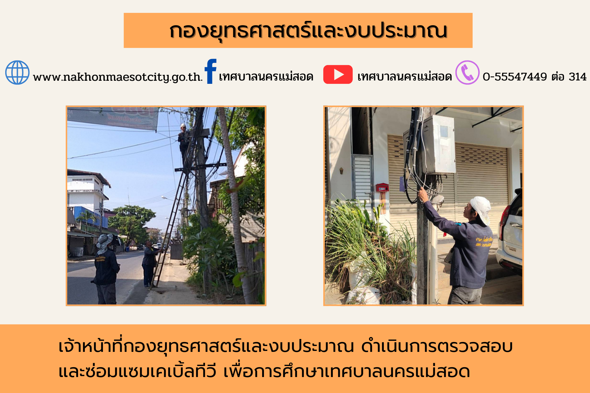 เมื่อวันพฤหัสบดี ที่ 9 มกราคม 2568 ว่าที่พันตรี ดร.ไพฑูรย์ ปริญญาธรรมกุล ผู้อำนวยการกองยุทธศาสตร์และงบประมาณ มอบหมายให้ เจ้าหน้าที่ฝ่ายวิเทศสัมพันธ์ กองยุทธศาสตร์และงบประมาณ ลงพื้นที่ดำเนินการตามคำร้องขอติดตั้งและซ่อมแซมเคเบิ้ลทีวี เพื่อการศึกษาเทศบาลนครแม่สอด