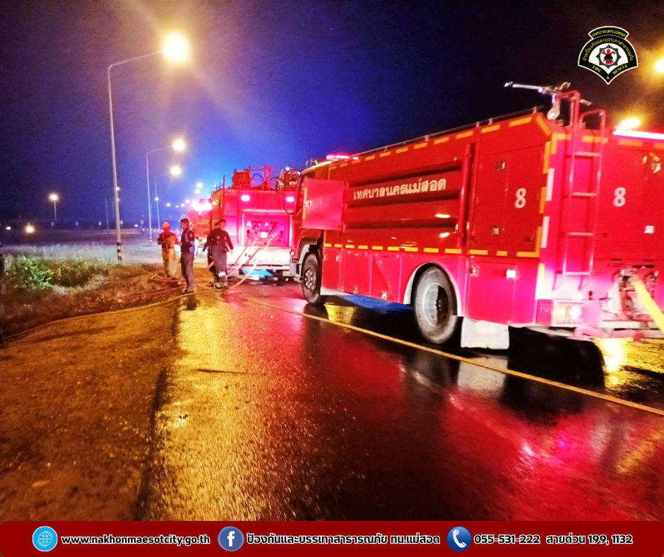 ฝ่ายป้องกันและบรรเทาสาธารณภัย เทศบาลนครแม่สอด จึงรายงานต่อ ว่าที่ร้อยตรีประเสริฐ ปวงละคร นายกเทศมนตรีนครแม่สอดทราบ และได้นำรถยนต์ดับเพลิง จำนวน 2 คัน, รถยนต์บรรทุกน้ำดับเพลิง จำนวน 4 คัน และรถยนต์กู้ภัยเคลื่อนที่เร็ว จำนวน 1 คัน พร้อมทีมนักผจญเพลิง ร่วมกับงานป้องกันและบรรเทาสาธารณภัยจากหน่วยใกล้เคียง, ฝ่ายปกครองอำเภอแม่สอด, ฉก.ราชมนู, แขวงทางหลวงตากที่ 2 (แม่สอด), สมาคม