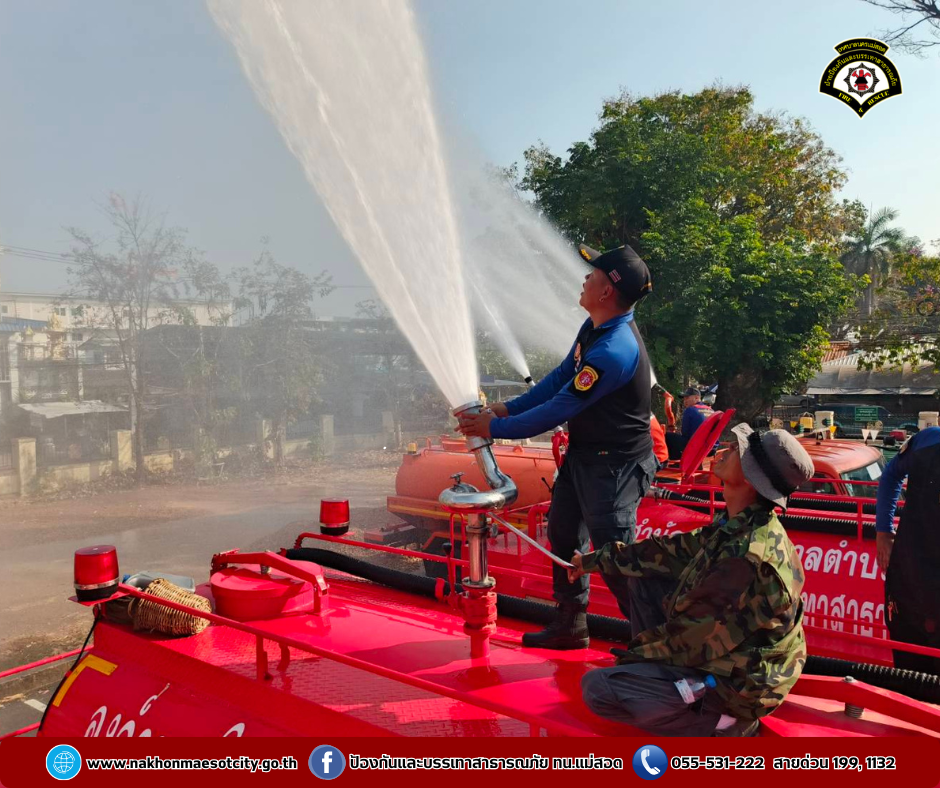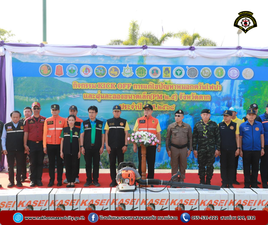 ว่าที่ร้อยตรี ประเสริฐ ปวงละคร นายกเทศมนตรีนครแม่สอด พร้อมด้วย คณะผู้บริหาร สมาชิกสภาเทศบาล และเจ้าหน้าที่ฝ่ายป้องกันและบรรเทาสาธารณภัยเทศบาลนครแม่สอด พร้อมรถดับเพลิงบรรทุกน้ำ เข้าร่วมการจัดกิจกรรม KICK OFF การแก้ไขปัญหาหมอกควันไฟป่าและฝุ่นละอองขนาดเล็ก (PM 2.5) จังหวัดตาก ประจำปี พ.ศ.2568 โดยมี นายชูชีพ พงษ์ไชยผู้ว่าราชการจังหวัดตาก เป็นประธานในพิธีเปิด และมีนายนิรุทร์ สาธุวงษ์ หัวหน้าสำนักงานป้องกันและบรรเทาสาธารณภัยจังหวัดตาก เป็นผู้กล่าวรายงาน โดยมีผู้เข้าร่วมกิจกรรมในครั้งนี้ จำนวน 500 คน