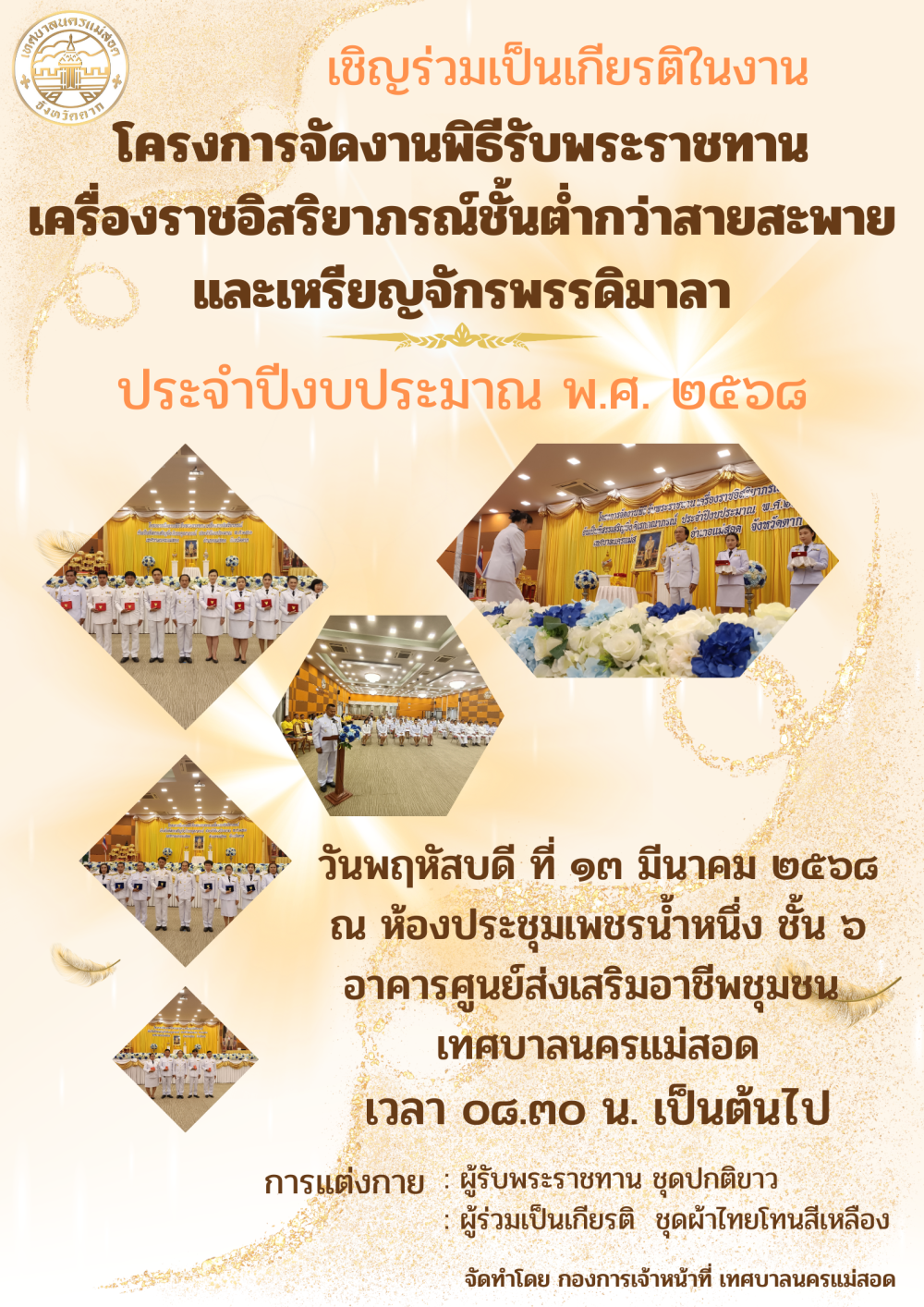 ขอเชิญร่วมเป็นเกียรติในงาน โครงการจัดงานพิธีรับพระราชทาน เครื่องราชอิสริยาภรณ์ชั้นต่ำกว่าสายสะพายและเหรียญจักรพรรดิมาลา ประจำปีงบประมาณ พ.ศ. 2568