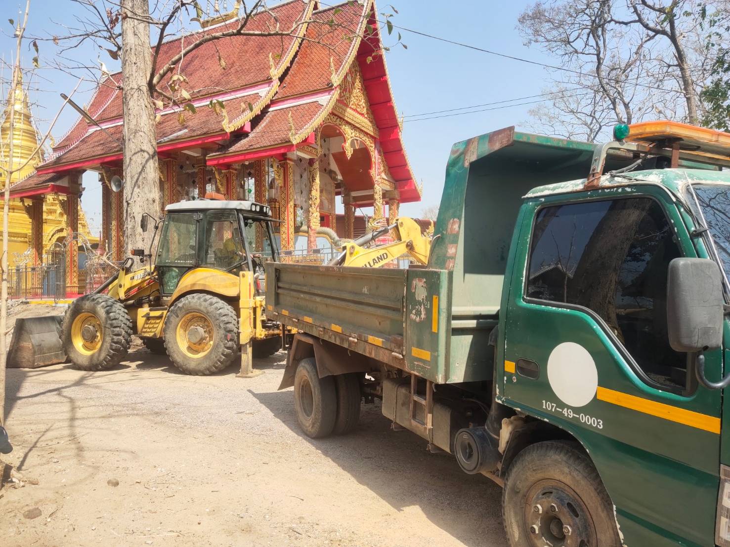 นำรถตักฯ พร้อมรถบรรทุก 6 ล้อ ตักเศษหินและวัสดุก่อสร้าง ภายในวัดสักทอง