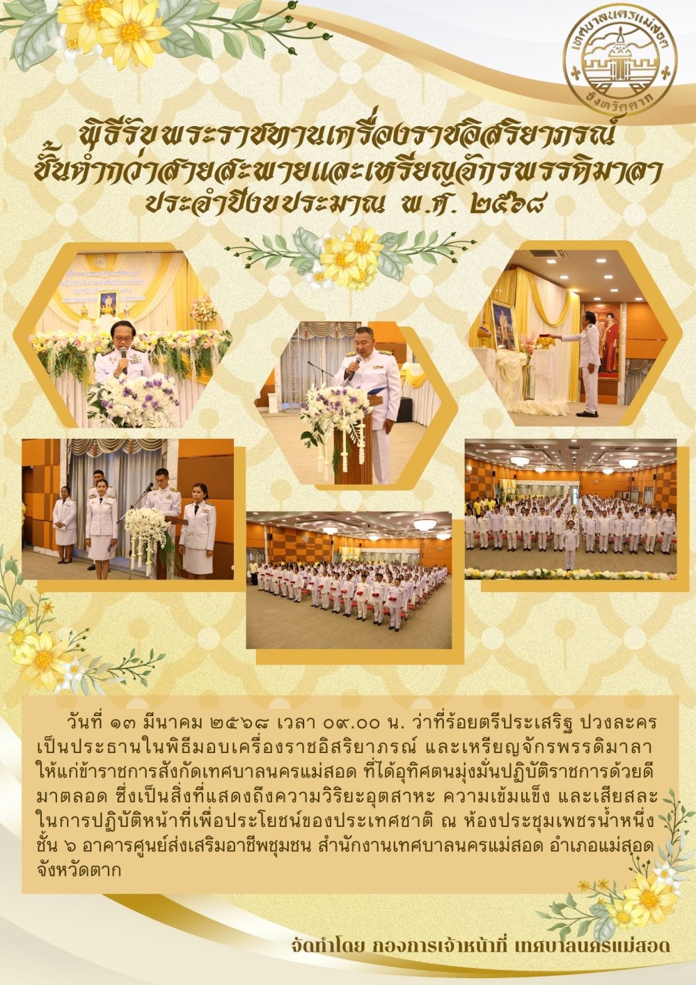 พิธีรับพระราชทานเครื่องราชอิสริยาภรณ์ ชั้นต่ำกว่าสายสะพายและเหรียญจักรพรรดิมาลา ประจำปีงบประมาณ พ.ศ. 2568
